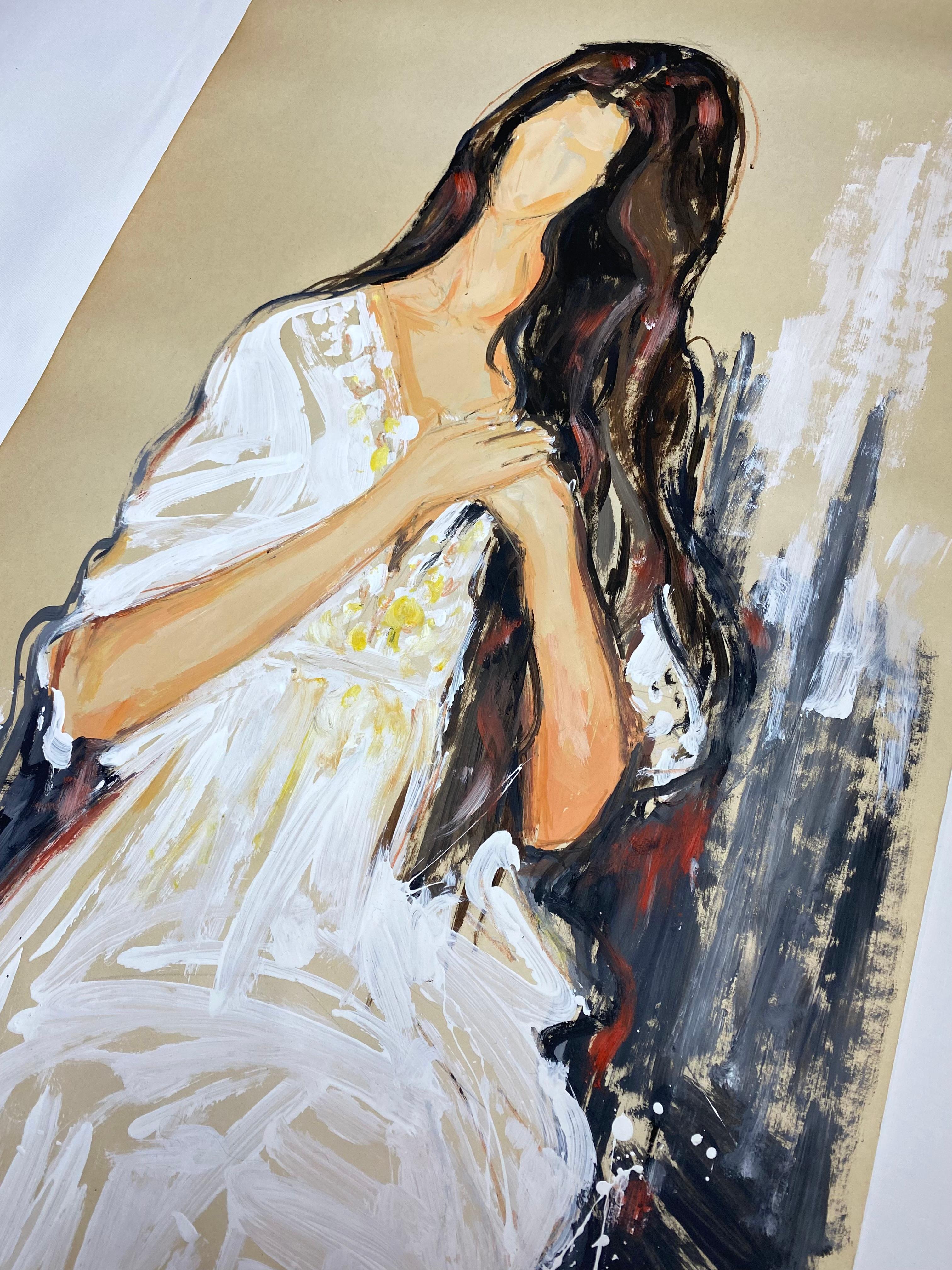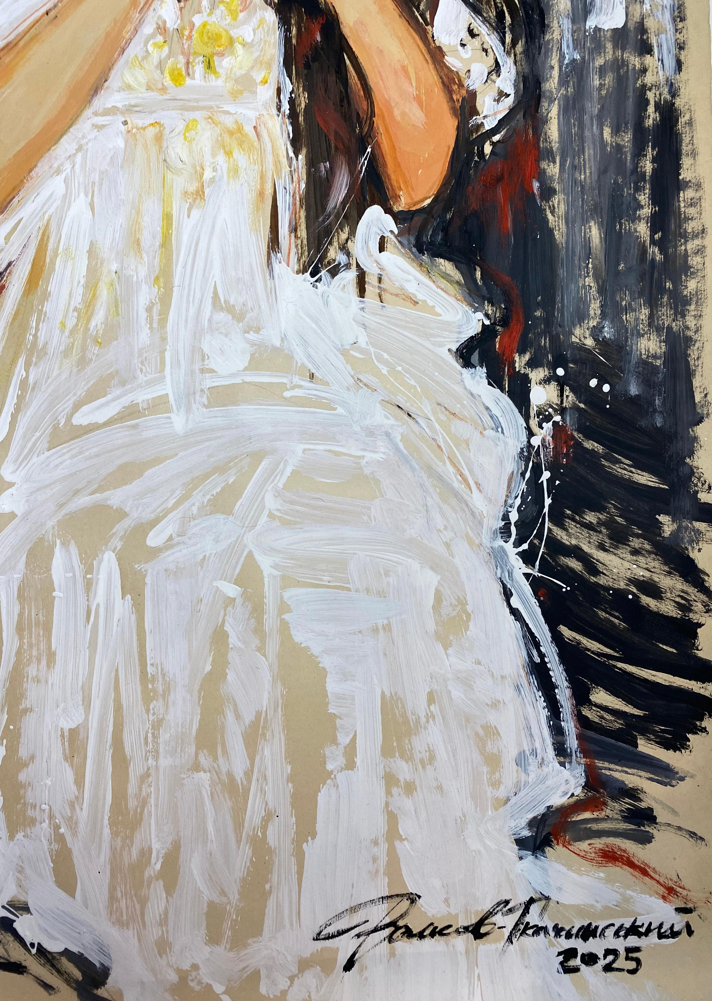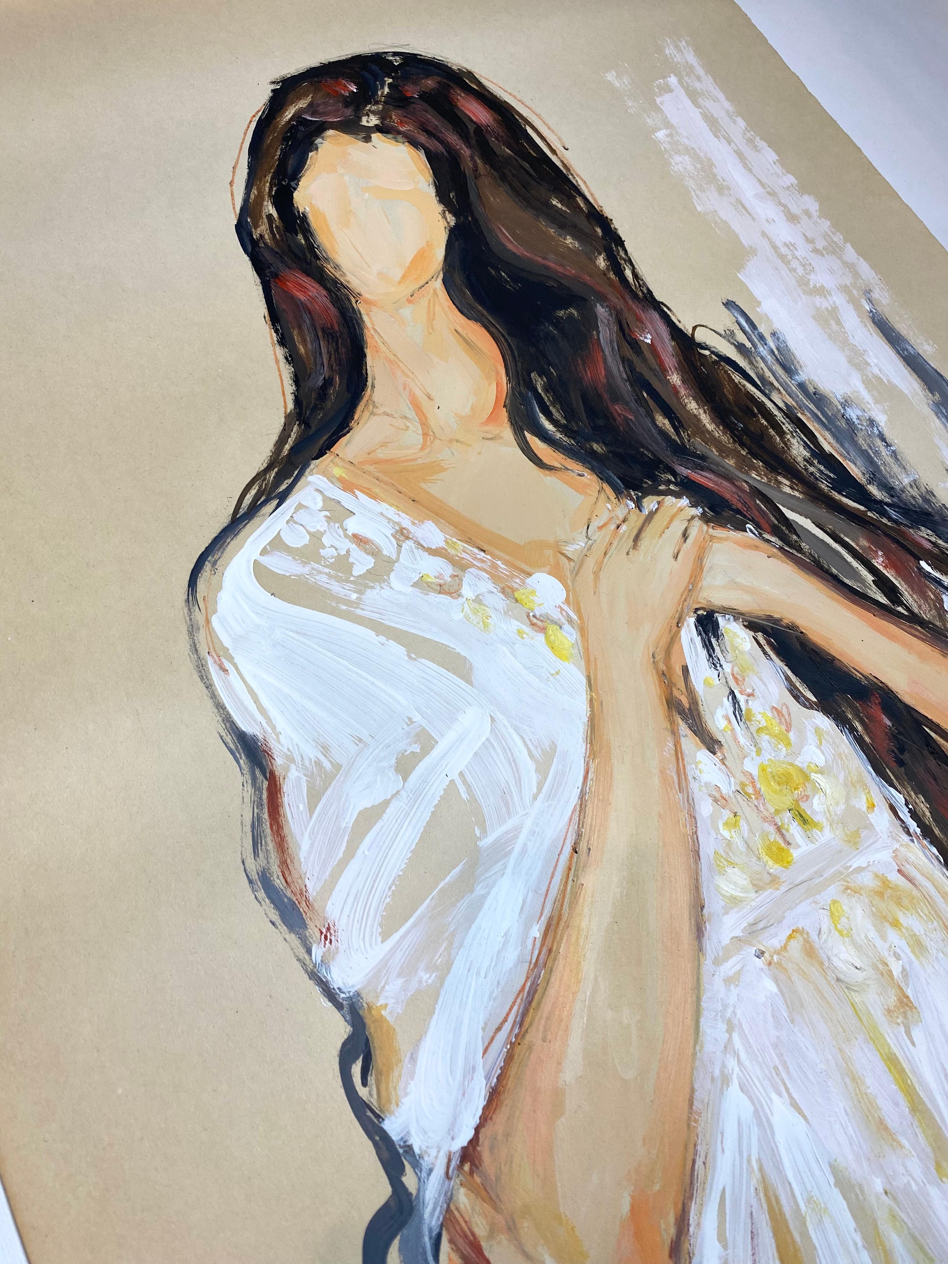 "Kateryna" - une représentation de l'amour capturée dans un geste calme et sincère : une femme en armure blanche porte ses mains près de son cœur. L'œuvre est créée de manière expressive sur du papier jaunâtre, laissant intentionnellement transparaître l'arrière-plan - comme un souvenir ou une lumière intérieure.