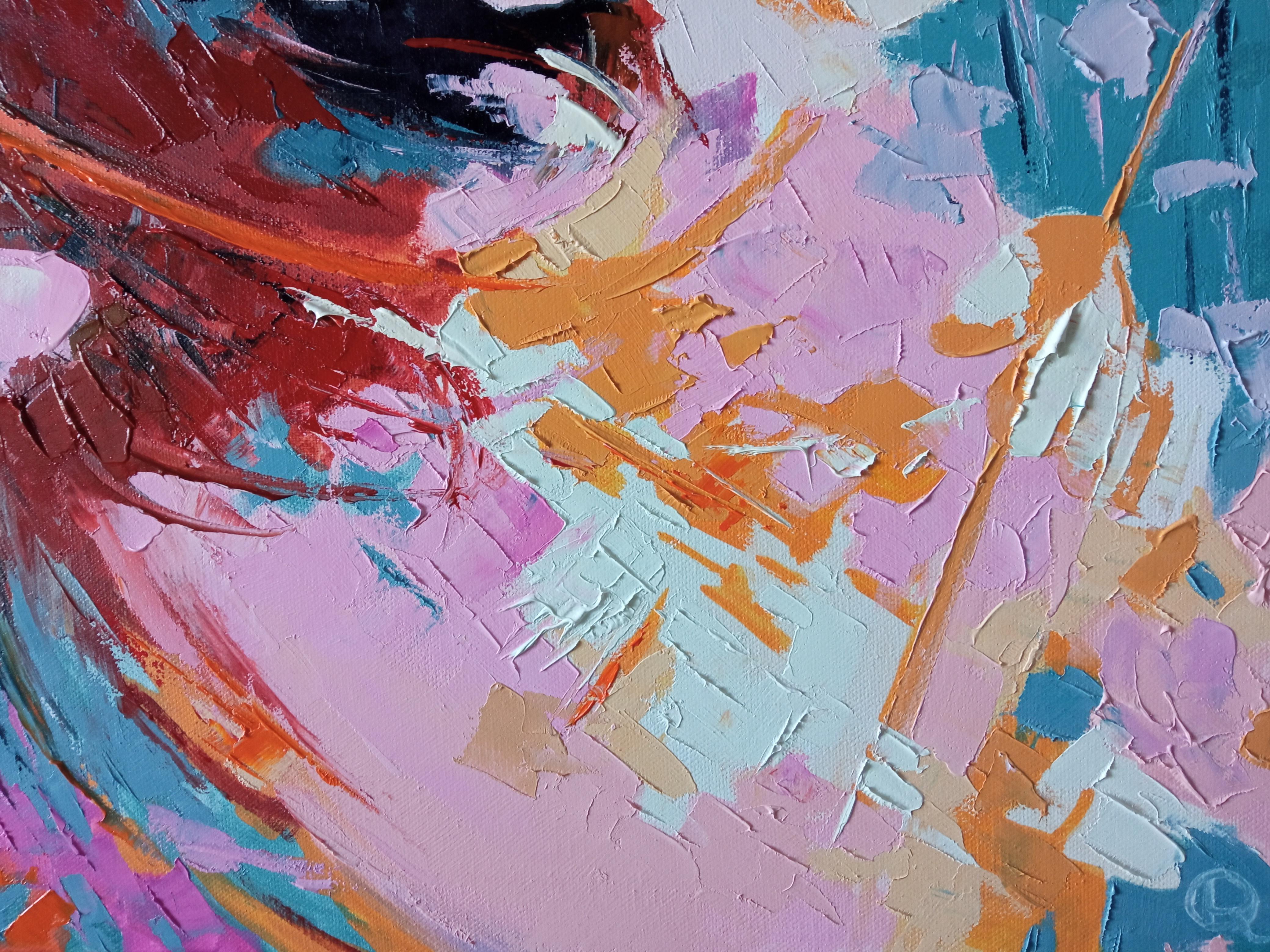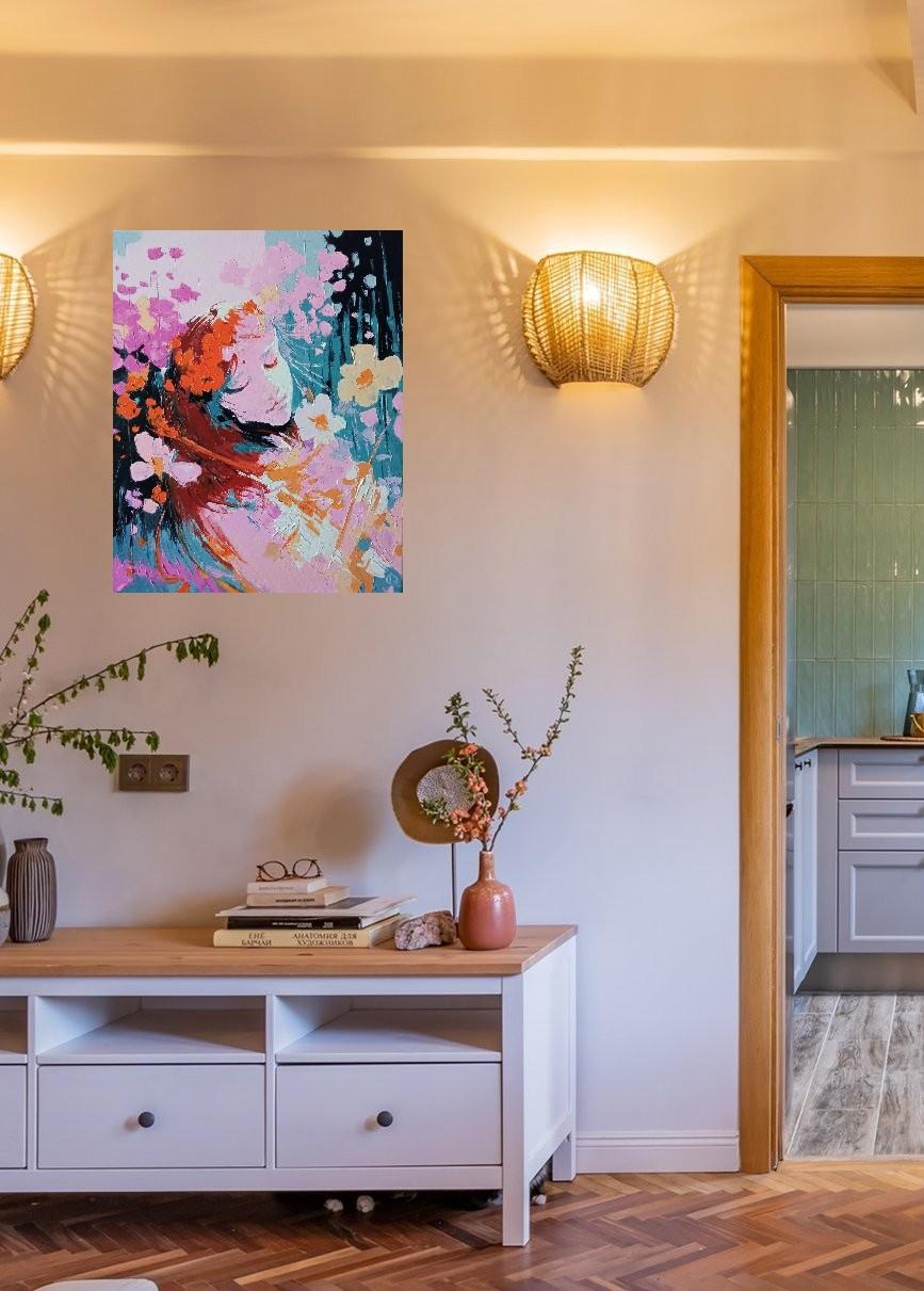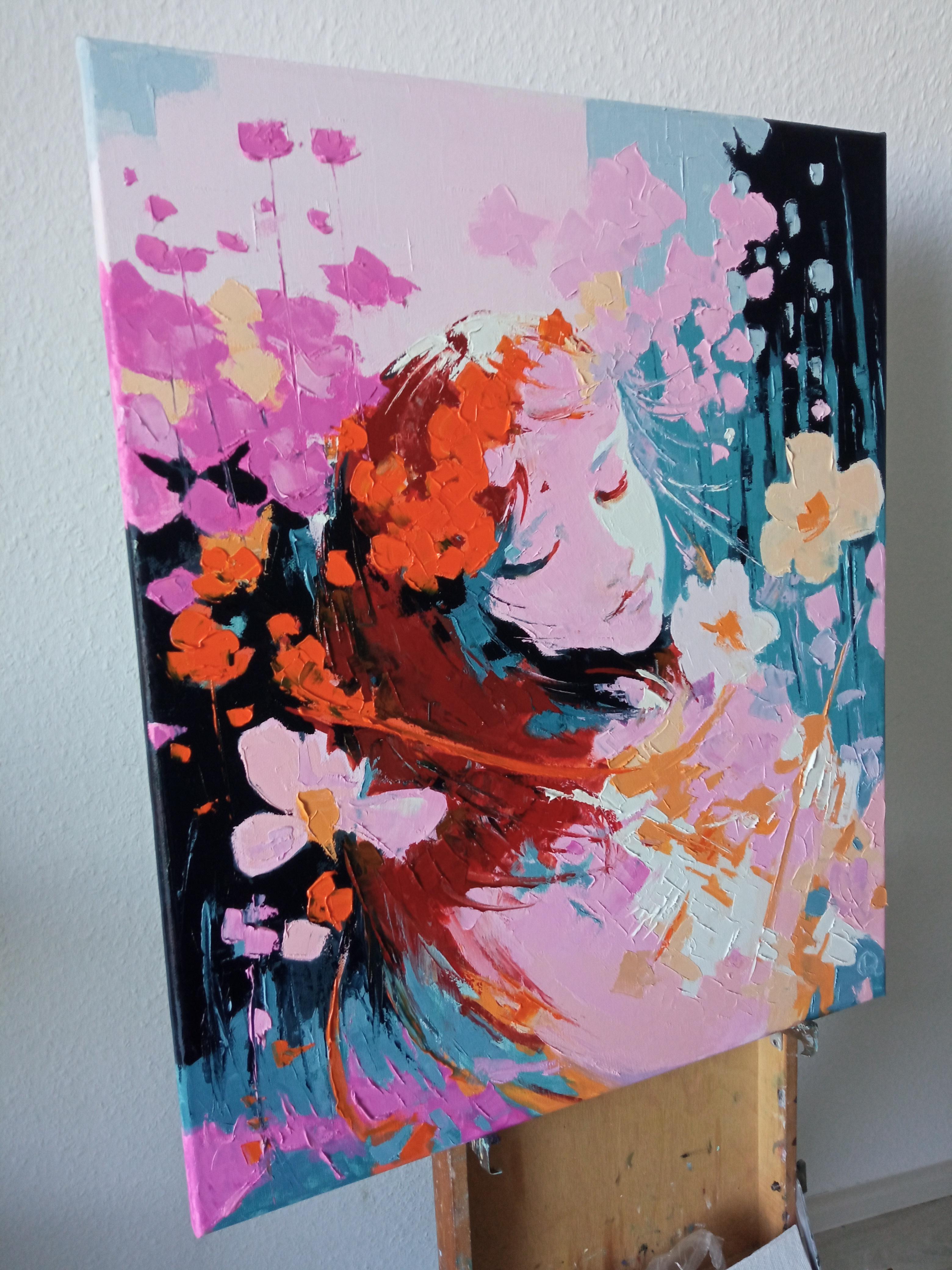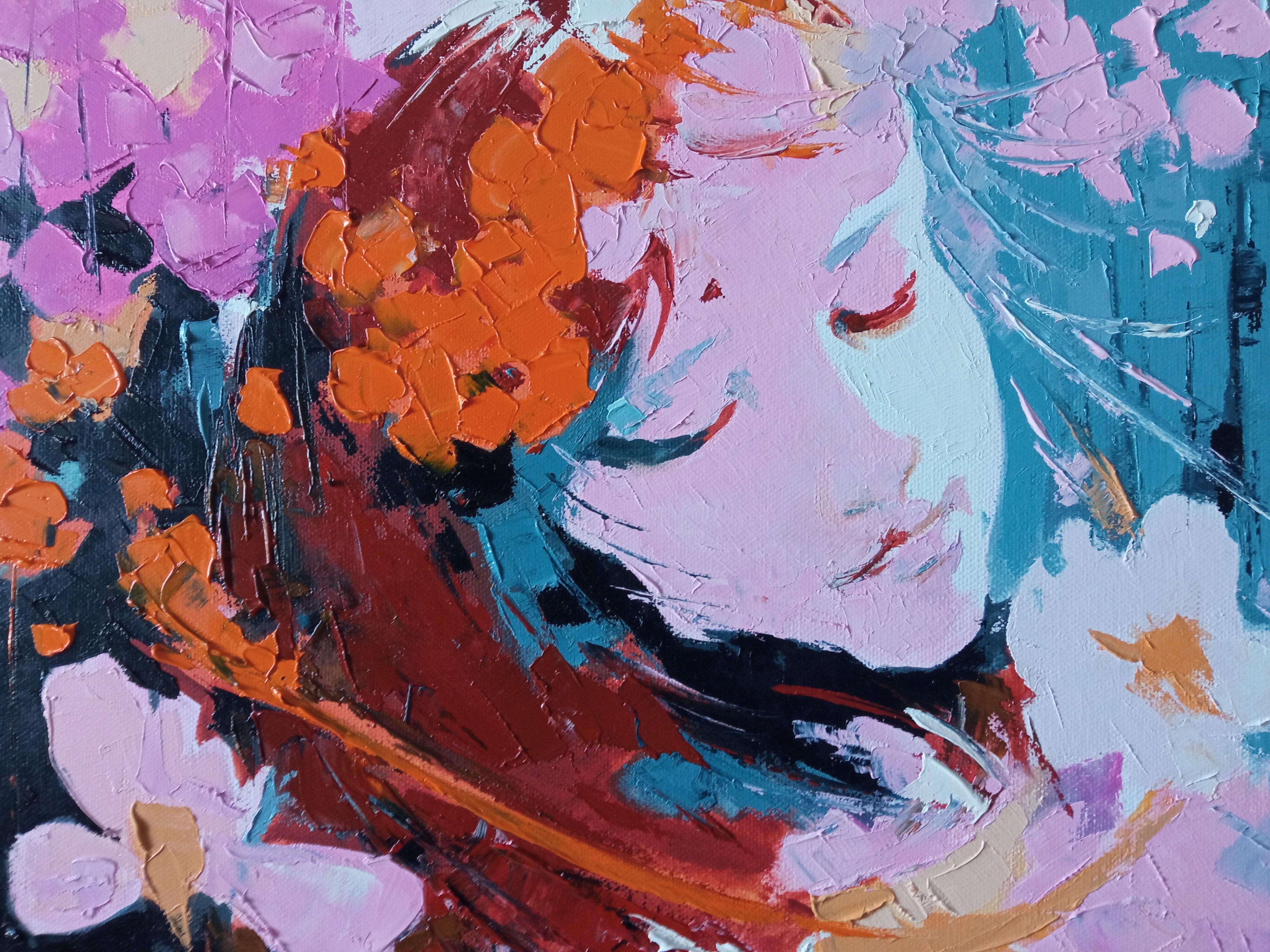 Le tableau "Peacefulness" est un poème visuel sur l'harmonie intérieure et la fusion subtile de l'humanité et de la nature. Au centre de la composition se trouve une jeune fille aux yeux fermés, perdue dans un bonheur tranquille, comme si elle se dissolvait dans un tourbillon de fleurs. Des coups de pinceau vibrants dans des couleurs riches - orange, lilas, turquoise et rose - traduisent non seulement le dynamisme de l'espace environnant, mais aussi la richesse de ses expériences intérieures.