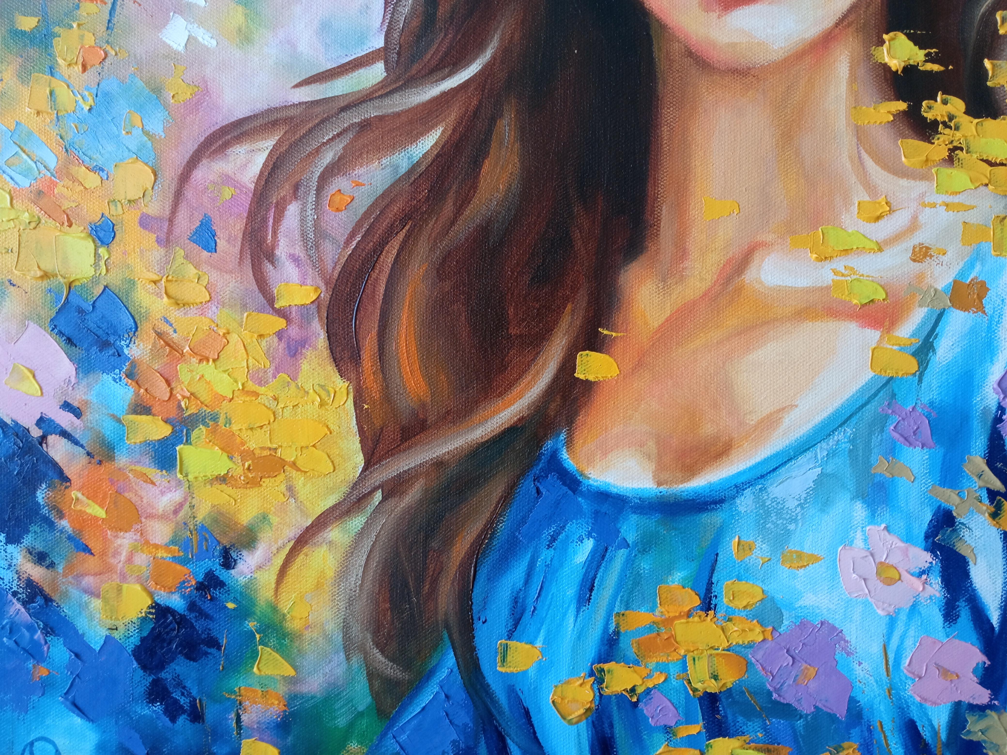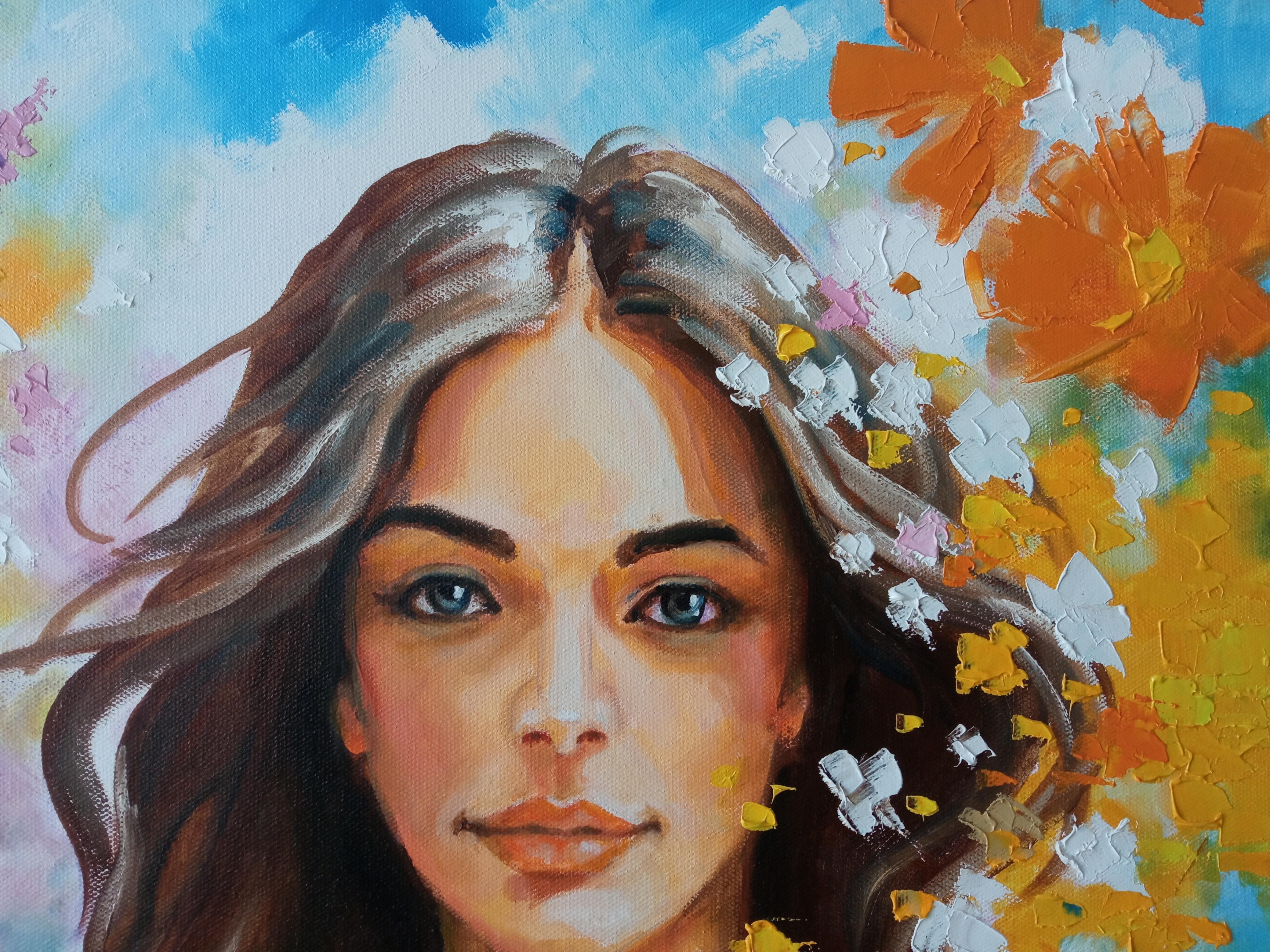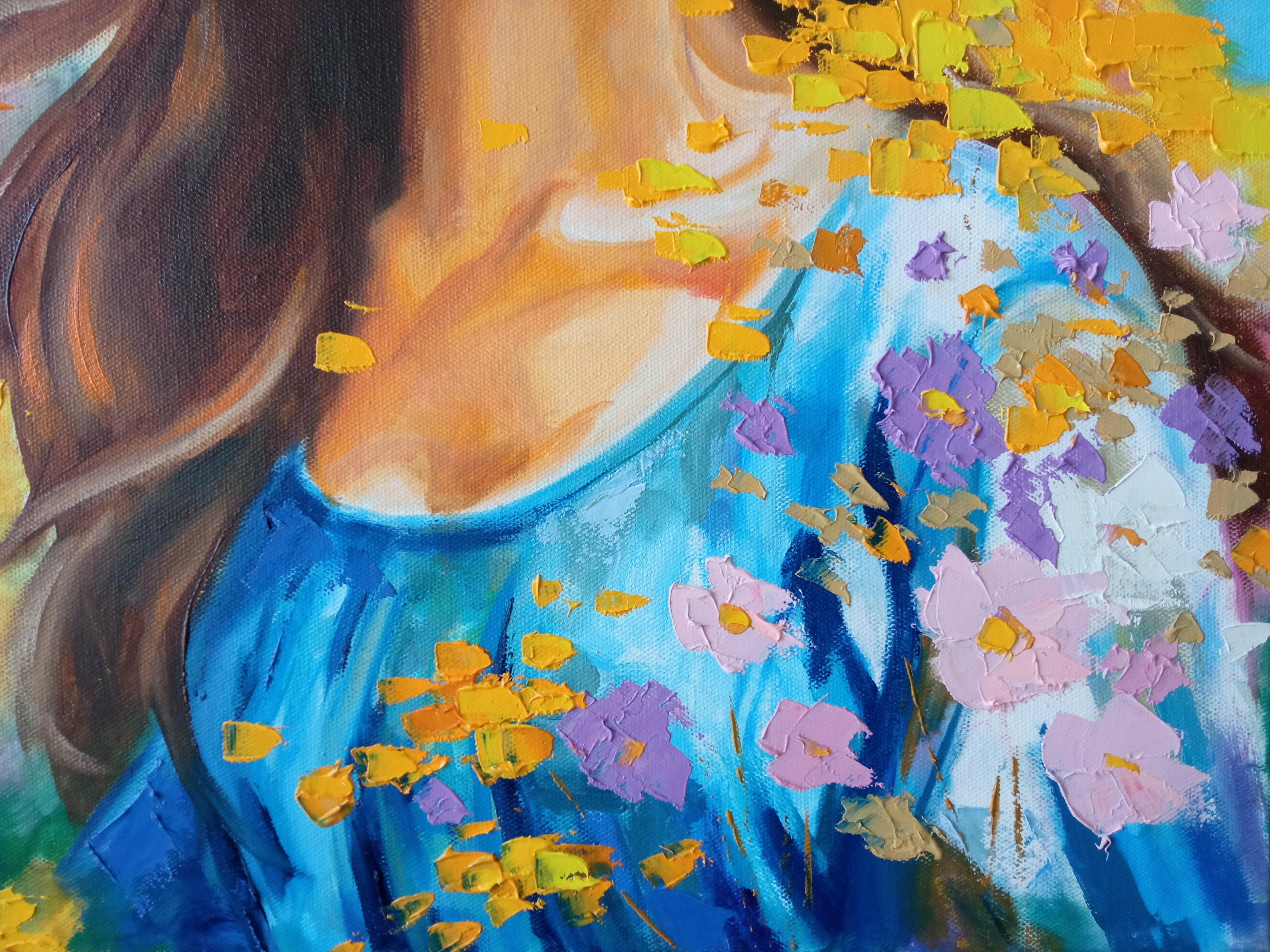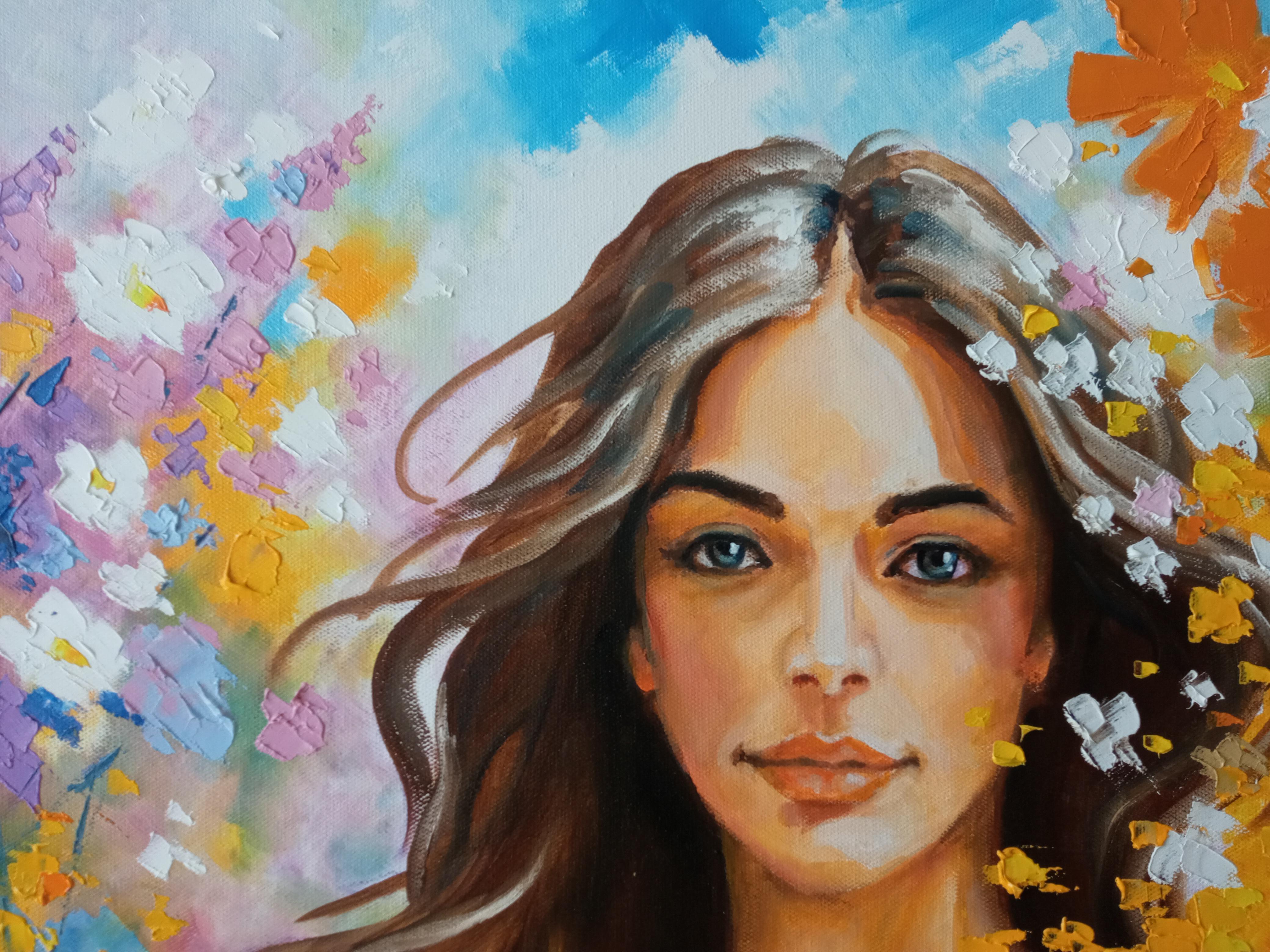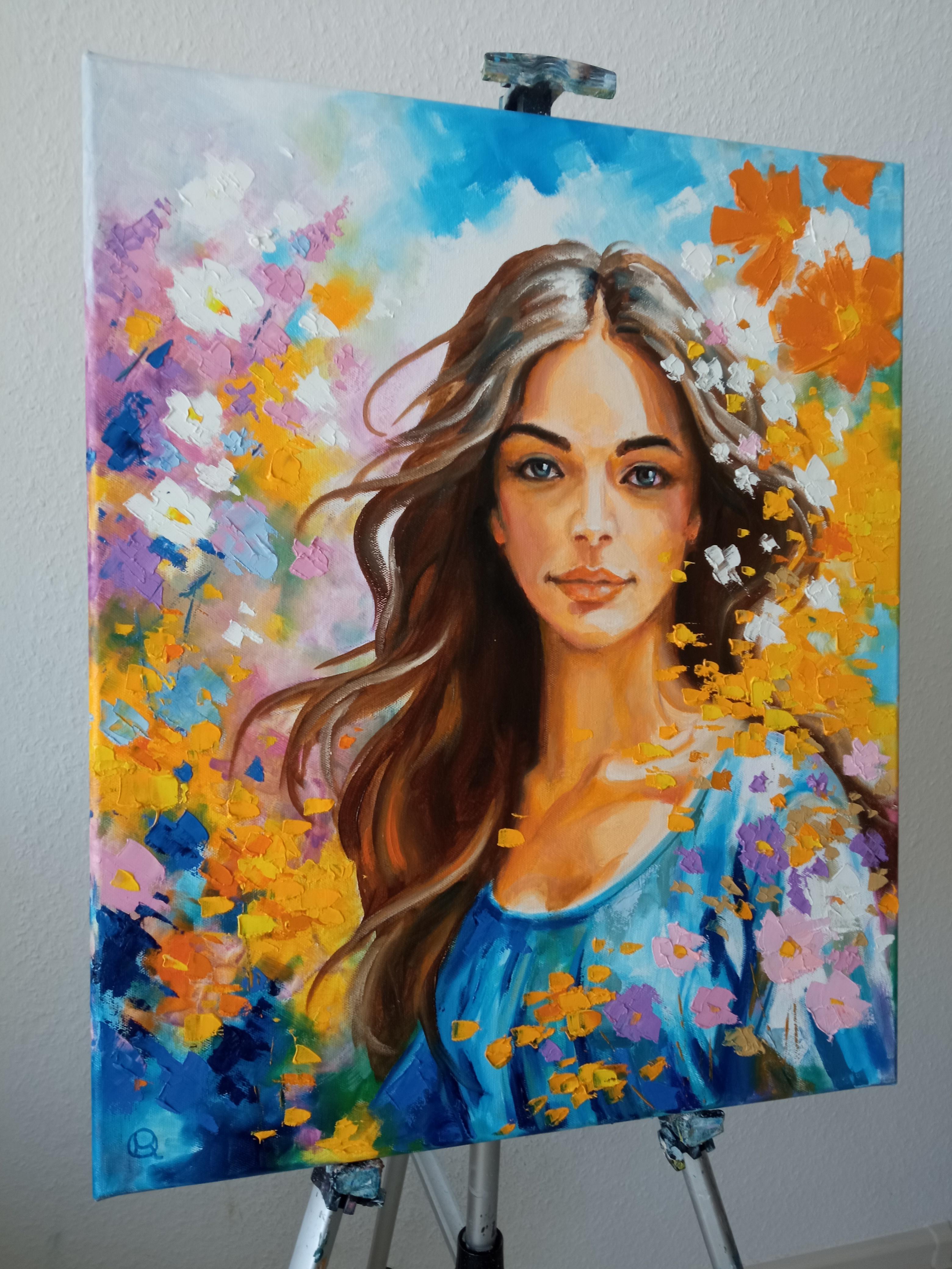 Cette peinture incarne la féminité, la lumière et la force intérieure. Le regard serein de la jeune femme reflète le calme et la foi, tandis que la brise dans ses cheveux évoque le changement. Les touches vives de fleurs qui l'entourent symbolisent l'éveil de l'âme et le renouvellement éternel de la vie.