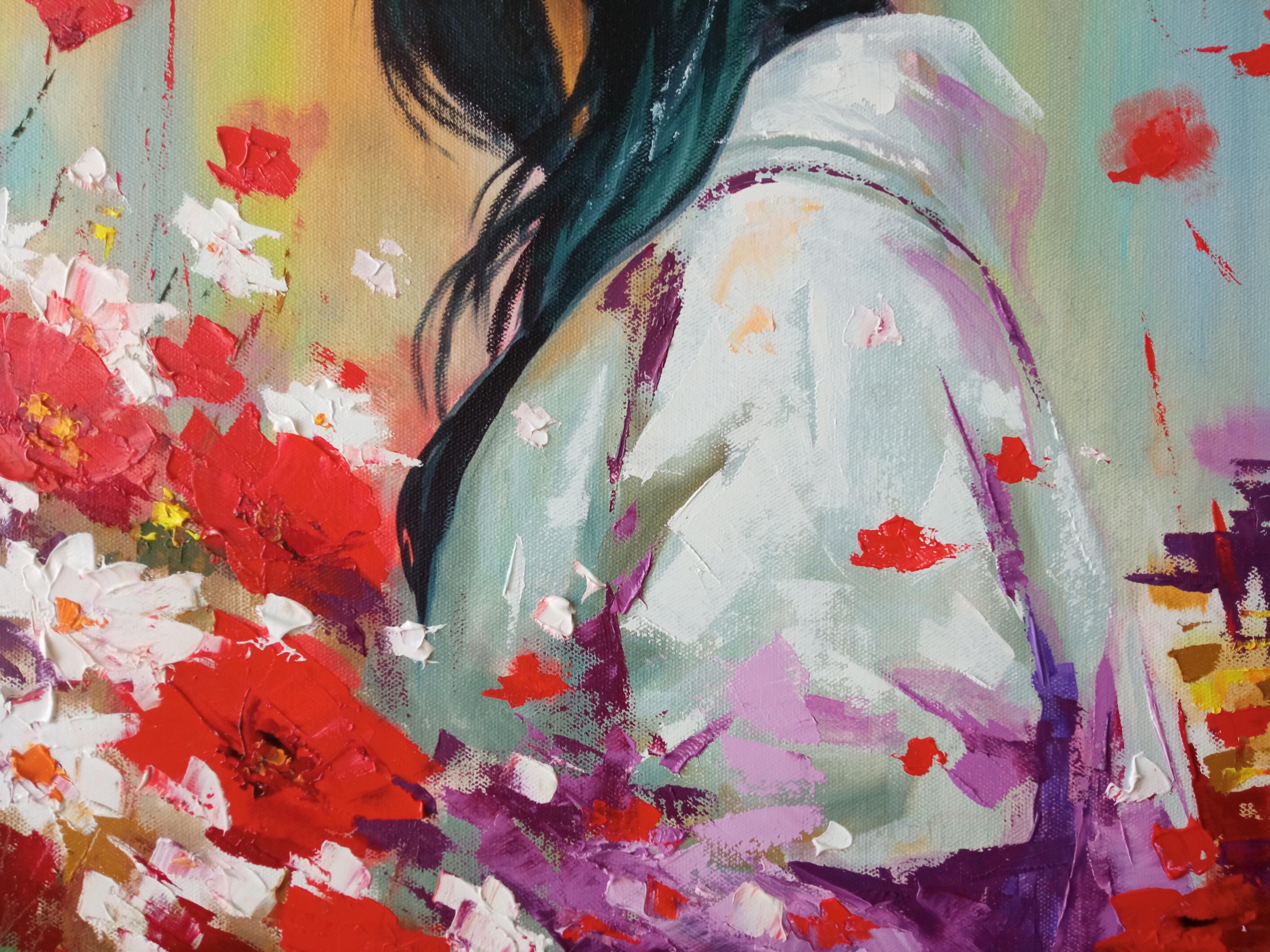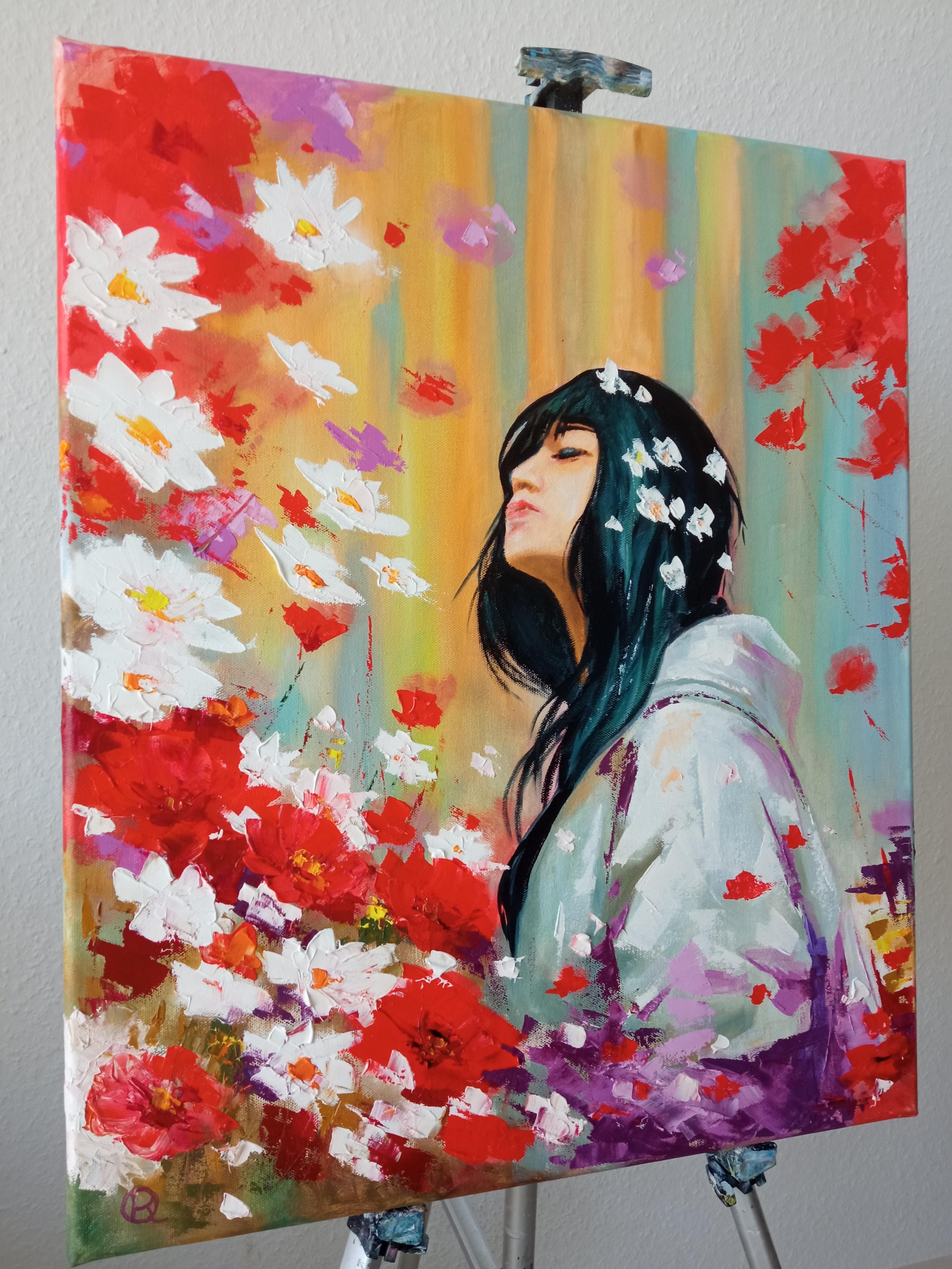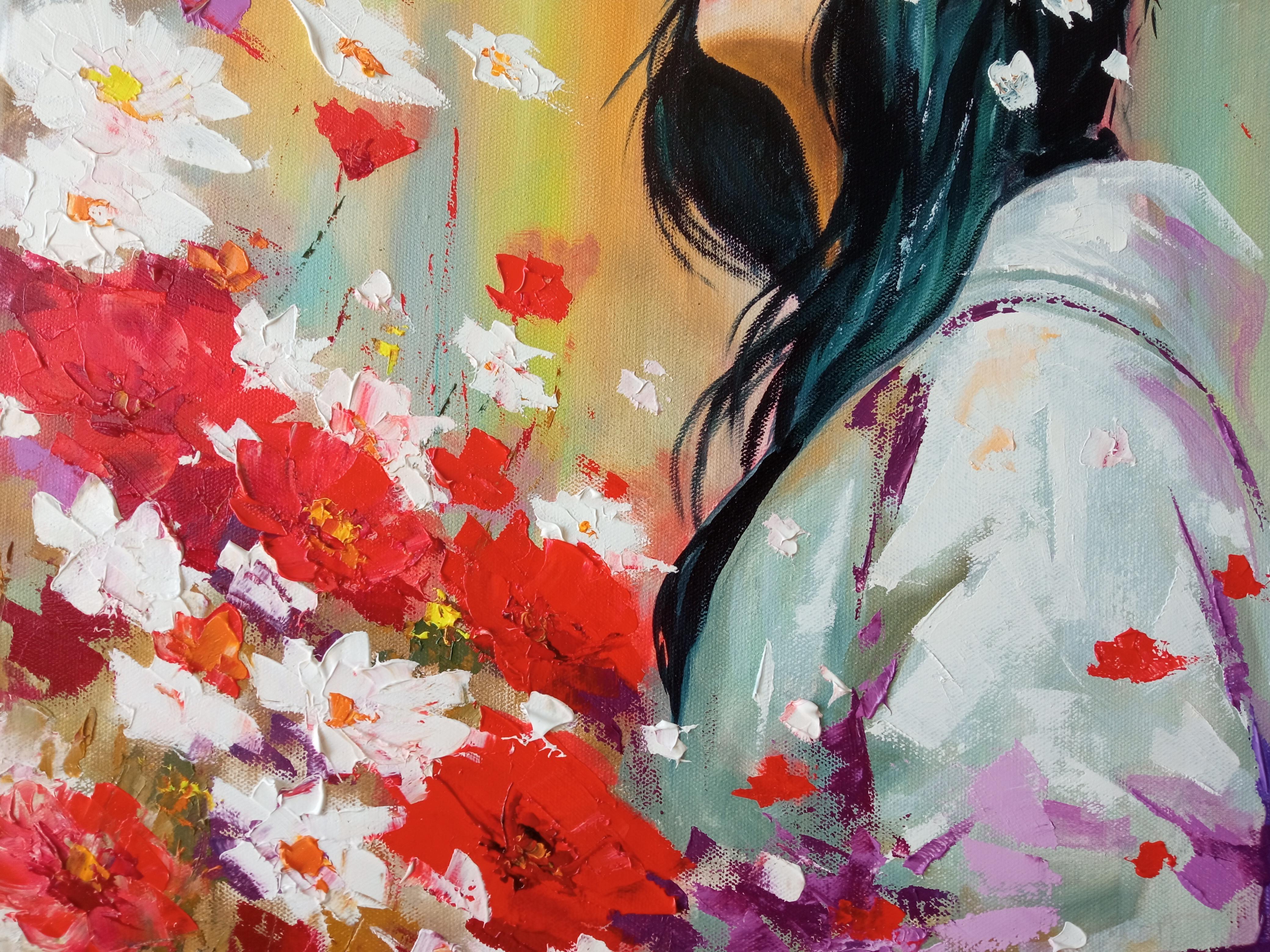 Cette œuvre d'art capture un moment de contemplation profonde et d'harmonie avec la nature. La figure d'une jeune femme, entourée de champs de fleurs vibrants, semble se dissoudre dans le rythme des couleurs et la sensation de légèreté. Les tons chauds et les coups de pinceau énergiques créent une atmosphère de liberté et de paix intérieure.