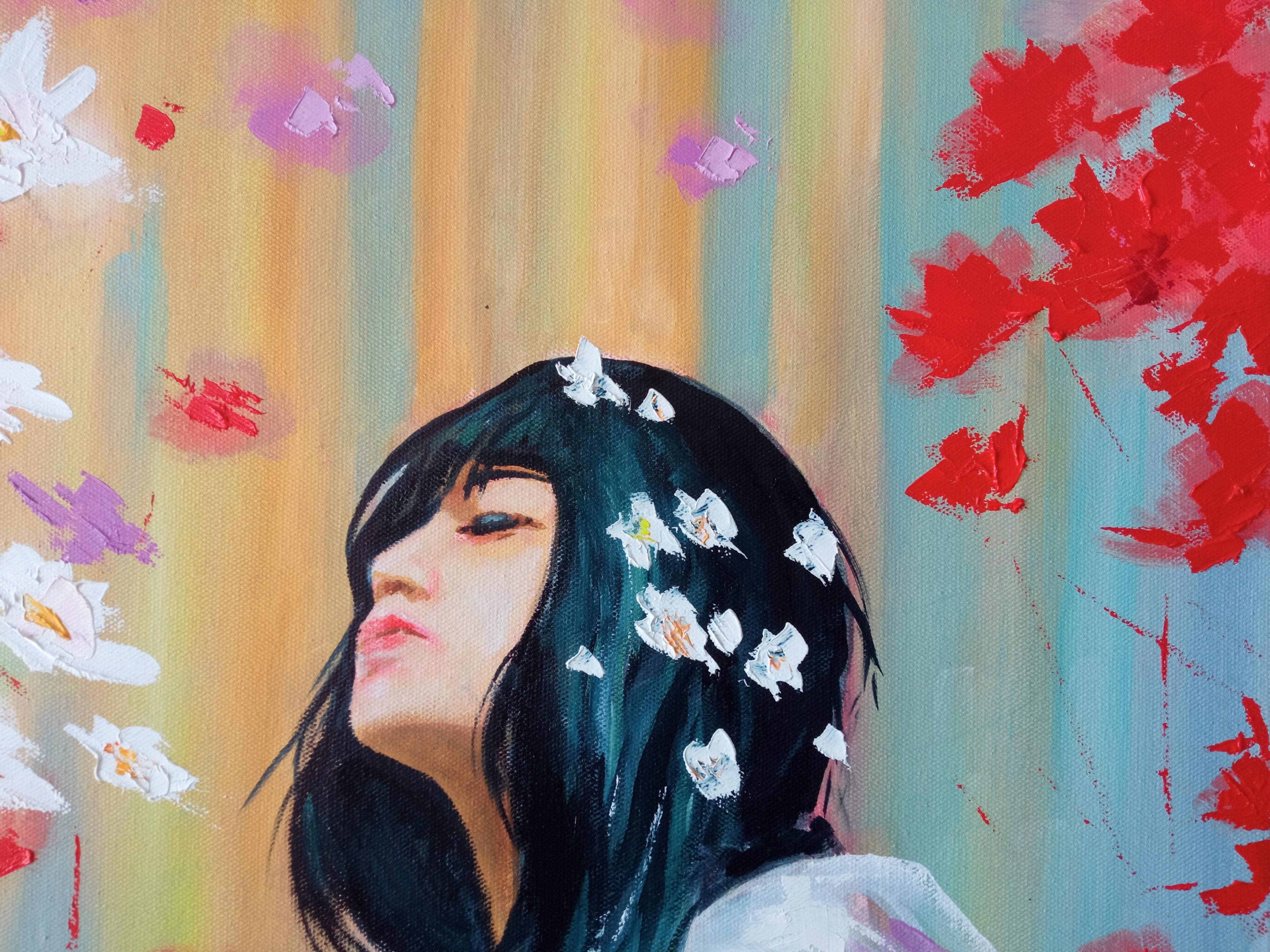 Dans le tableau "Caution", l'artiste capture l'état émotionnel délicat d'une jeune femme entourée d'un tourbillon de pétales en fleurs. S...