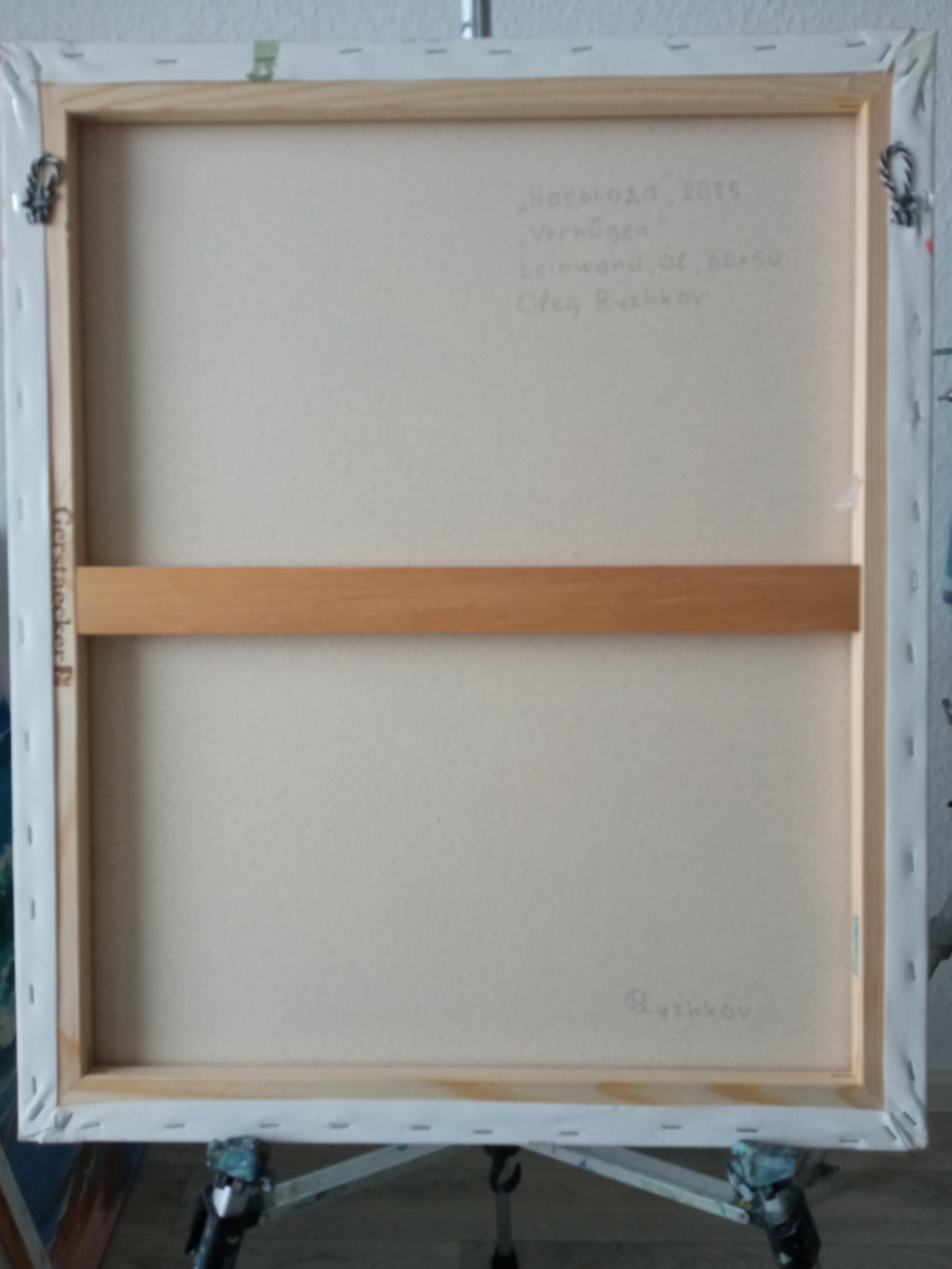 Exécuté dans une technique mixte d'huile et d'acrylique, le tableau met en évidence le contraste entre l'arrière-plan expressif et vif et la douceur lyrique de la figure centrale. La jouissance est une métaphore des instants fugaces de bonheur, lorsqu'on s'abandonne complètement à la beauté de la nature et au souffle de la vie.