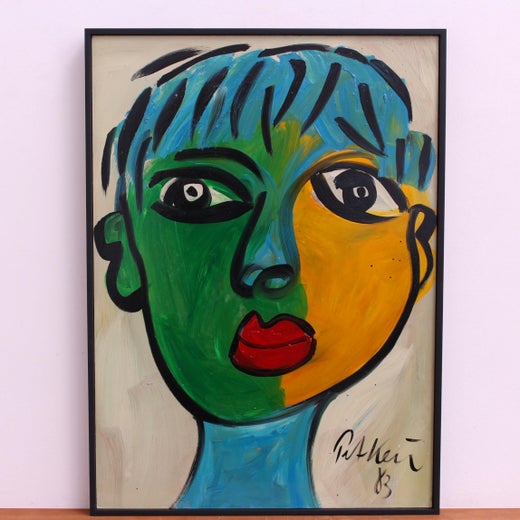 Portrait d'une femme aux cheveux courts, huile sur panneau, par Peters Robert Keil (1983). Une femme aux yeux écarquillés regarde le spectateur avec un sourire tranquille. Les couleurs apparaissent en quadrants dans la composition, reflétant peut-être les nombreuses humeurs du sujet. Keil utilise des couleurs intenses et floues qui sont devenues caractéristiques de son style pictural. Les seules contraintes sont les limites de la surface peinte. L'œuvre est en bon état général et a été nouvellement encadrée dans un plateau. L'artiste a signé et daté l'œuvre en bas à droite. Veuillez apprécier les nombreuses photos qui accompagnent l'annonce. Sur demande, une vidéo peut être fournie.
