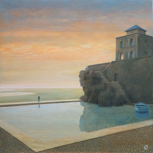 Philippe Charles Jacquet n'est pas seulement un peintre de paysages, c'est un créateur. Jacquet est passé maître dans l'art de combiner le réel et l'imaginaire. Par conséquent, ses compositions, fortement inspirées par les côtes bretonnes et les estuaires, ont un élément sublime et s'inscrivent profondément dans le subconscient. Bien qu'il peigne des paysages clairsemés, il y a quelque chose de fondamentalement agréable dans la qualité surréaliste et idéalisée de son travail. Jacquet est un peintre d'architecture ; il planifie ses paysages et leurs environnements construits avec une précision mesurée, les construisant à l'aide d'une variété de médias et de méthodes jusqu'à ce qu'ils soient aussi réels qu'imaginés. La matérialité travaillée, de l'eau comme un miroir au grain de bois marqué par la rouille, donne vie à ses compositions peintes. La combinaison de textures, de précision géométrique et de couleurs concises crée un ésotérisme qui inclut les spectateurs plutôt que de les exclure. Les structures solitaires de Jacquet ne rejettent pas mais enveloppent le spectateur dans la familiarité d'un sentiment.