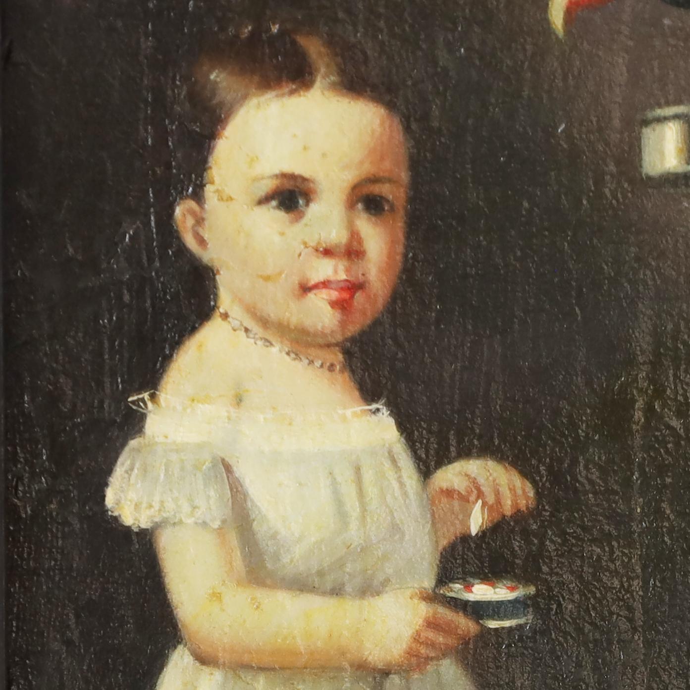 Charmante petite peinture à l'huile sur toile du XIXe siècle représentant une jeune fille en robe dans une scène d'intérieur avec un perroquet et un chien, exécutée dans le style caractéristique de la première école américaine de portrait. Vestiges des mots New York imprimés au dos de la toile.