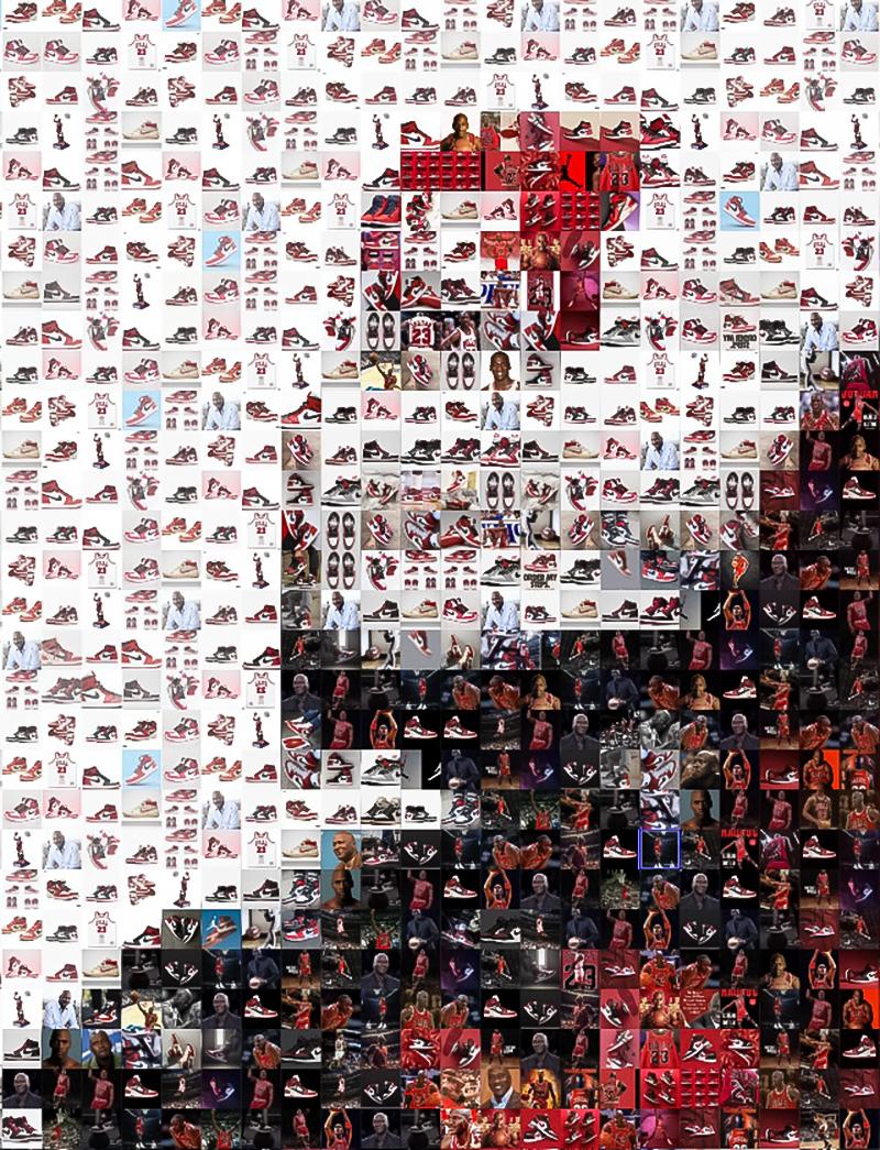 "Air Jordan" est une œuvre d'art en photomosaïque acrylique réalisée par Destro. La première version d'une série de mosaïques intitulée "Icônes". Destro a créé de grands tirages com...
