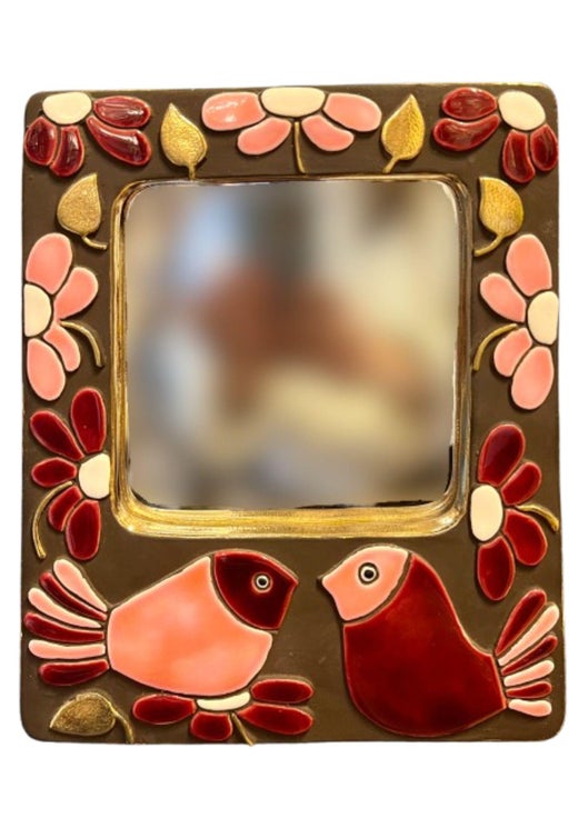 Superbe miroir aux motifs floraux et animaliers de l'artiste céramiste Mithé Espelt.
