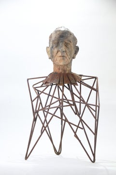 Buste expressif en céramique avec émaux de grand feu, tête peinte à l'huile et lunettes en fer forgé explorant l'identité, l'apprentissage et le corps vieillissant.