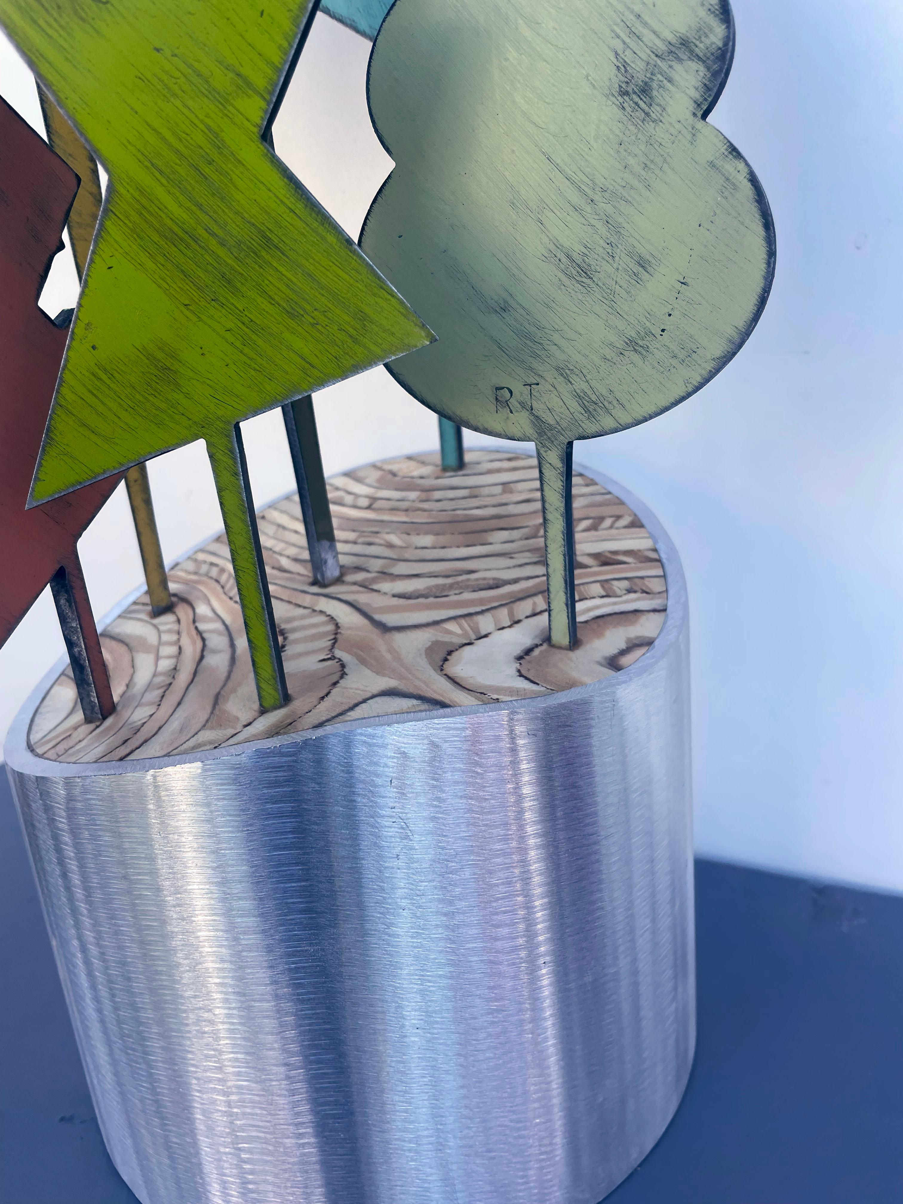 "Planet - Ash" fait partie d'une série de sculptures sur table qui abordent le thème du changement climatique. Dans ces petits environnements ronds, un groupe d'arbres abstraits habite une partie d'un paysage vallonné. Les arbres sont bordés de patine noire en référence au réchauffement de notre planète et à l'aggravation du nombre d'incendies chaque année. Malgré la menace réelle des catastrophes naturelles et de la montée des eaux, ma série Planète utilise des palettes de couleurs optimistes et un éventail ludique de formes d'arbres pour envoyer un message d'espoir, à savoir que l'humanité réduira le fléau des combustibles fossiles dans l'atmosphère pour que notre planète reste vivable. Les matériaux utilisés sont l'aluminium pour les arbres et la base, le contreplaqué stratifié pour la colline, la peinture émaillée et le vernis.
