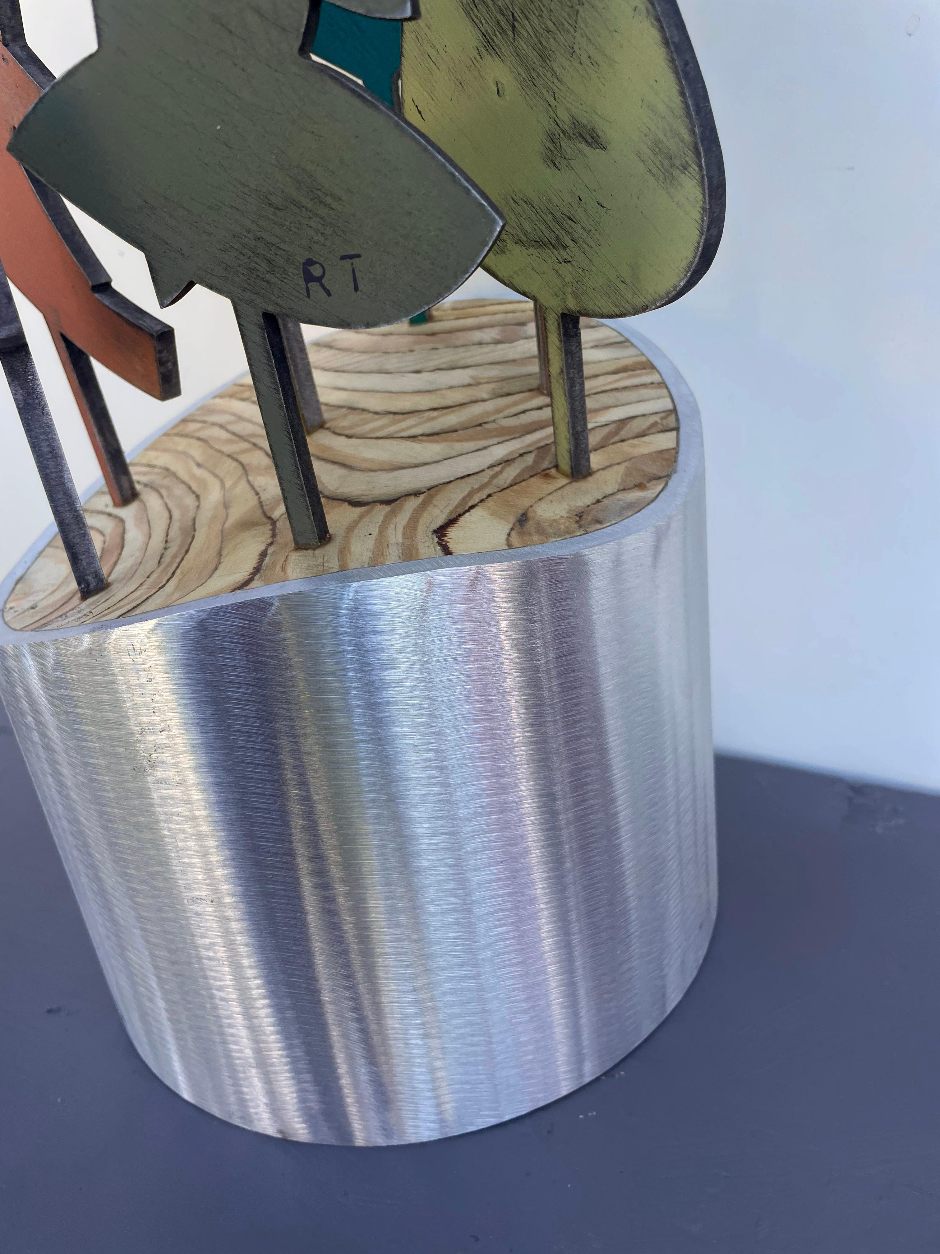 "Planet - Maple" fait partie d'une série de sculptures sur table qui abordent le thème du changement climatique. Dans ces petits environnements ronds, un groupe d'arbres abstraits habite une partie d'un paysage vallonné. Les arbres sont bordés de patine noire en référence au réchauffement de notre planète et à l'aggravation du nombre d'incendies chaque année. Malgré la menace réelle des catastrophes naturelles et de la montée des eaux, ma série Planète utilise des palettes de couleurs optimistes et un éventail ludique de formes d'arbres pour envoyer un message d'espoir, à savoir que l'humanité réduira le fléau des combustibles fossiles dans l'atmosphère pour que notre planète reste vivable. Les matériaux utilisés sont l'aluminium pour les arbres et la base, le contreplaqué stratifié pour la colline, la peinture émaillée et le vernis.