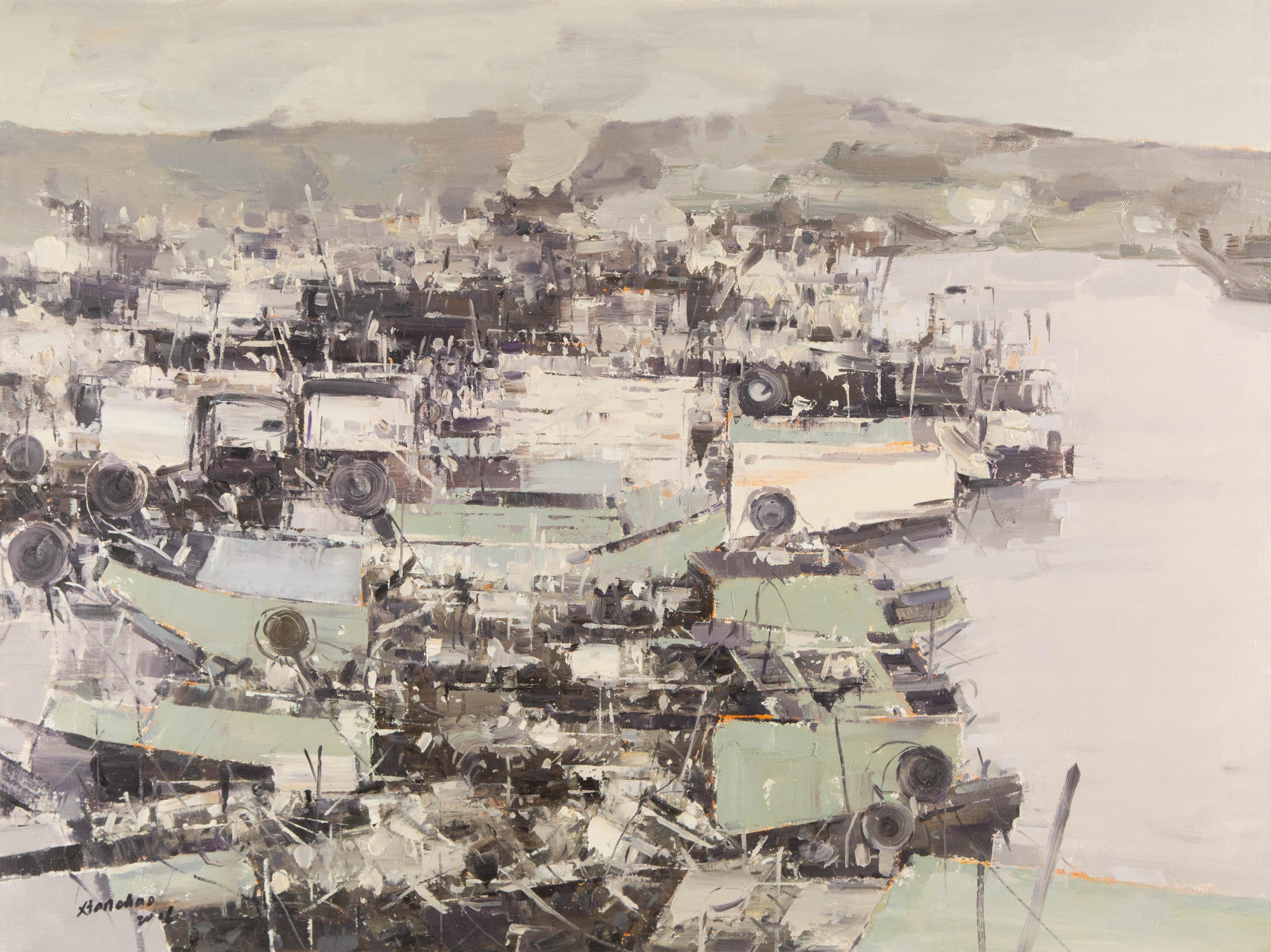 Ce magnifique tableau de Jeroen Allart fait partie d'une série de peintures minimalistes de paysages et d'animaux qu'il a réalisées dans son pays d'origine, les Pays-Bas. Une ferme s...