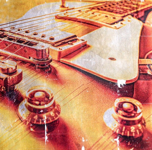 Color of Sound Series : 6 de Mark Jackson est une magnifique photographie d'une guitare électrique bleue imprimée sur argent et suspendue sur un panneau de bois. La texture du corps de la guitare et des cordes complète la texture brillante de l'argent, créant ainsi une composition brillante.
