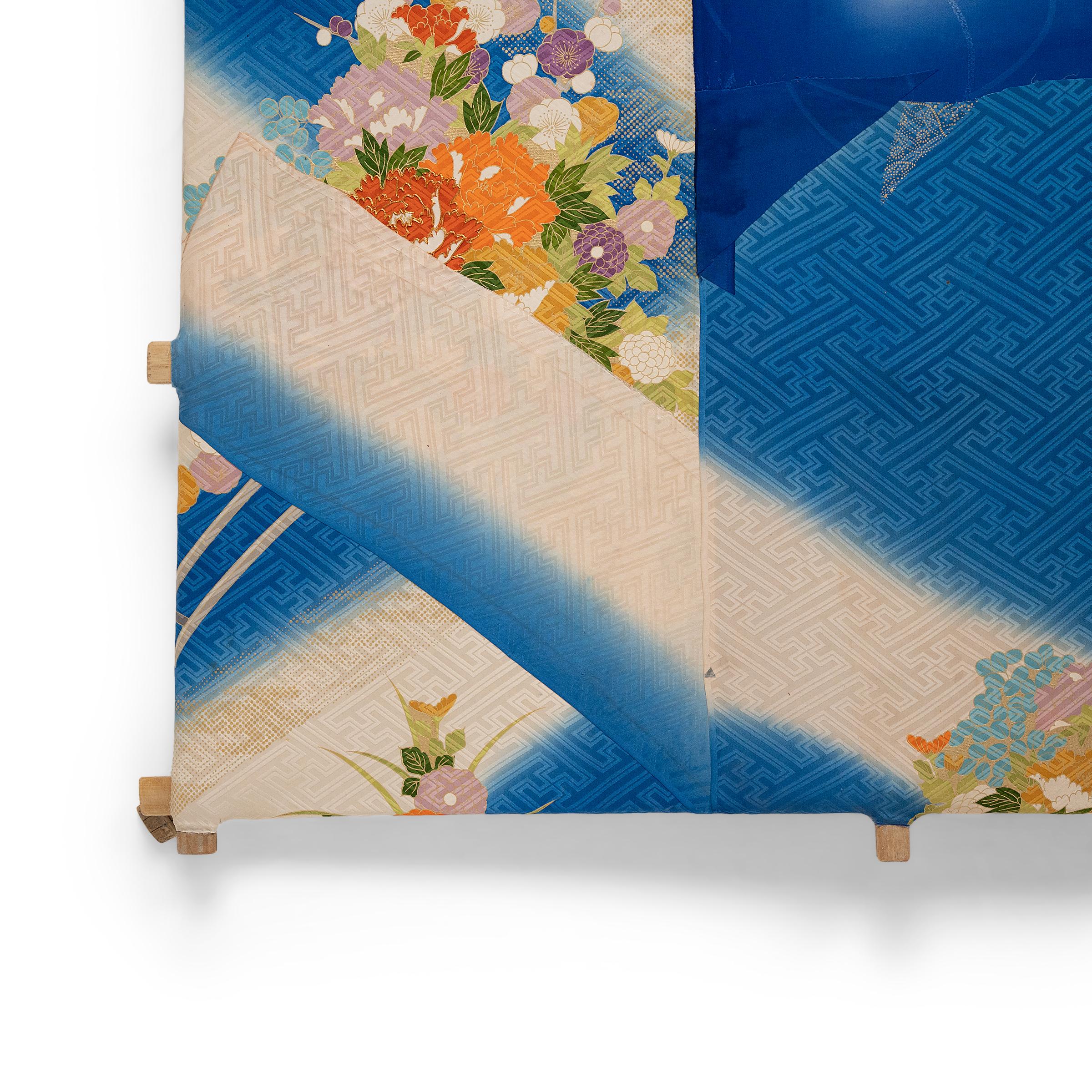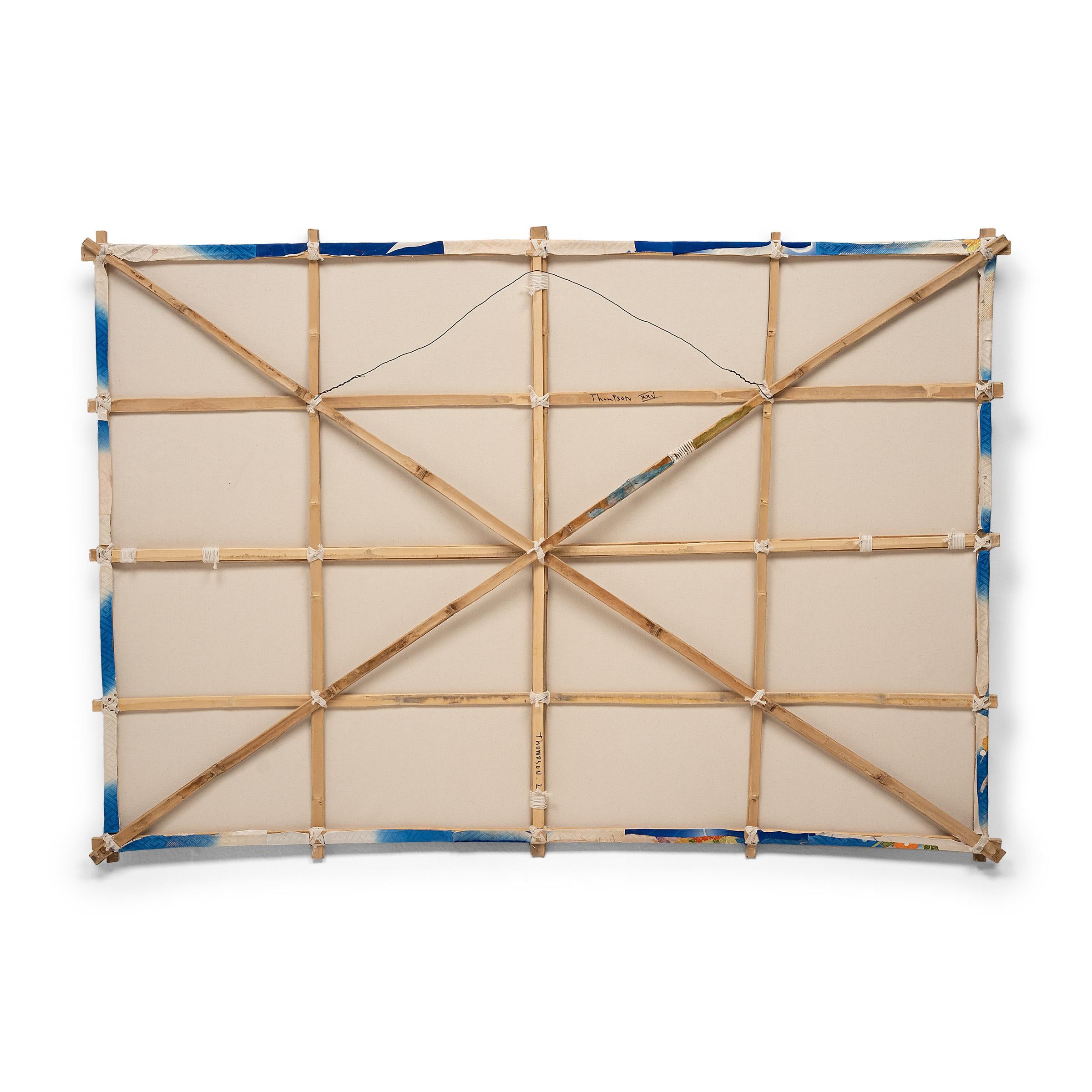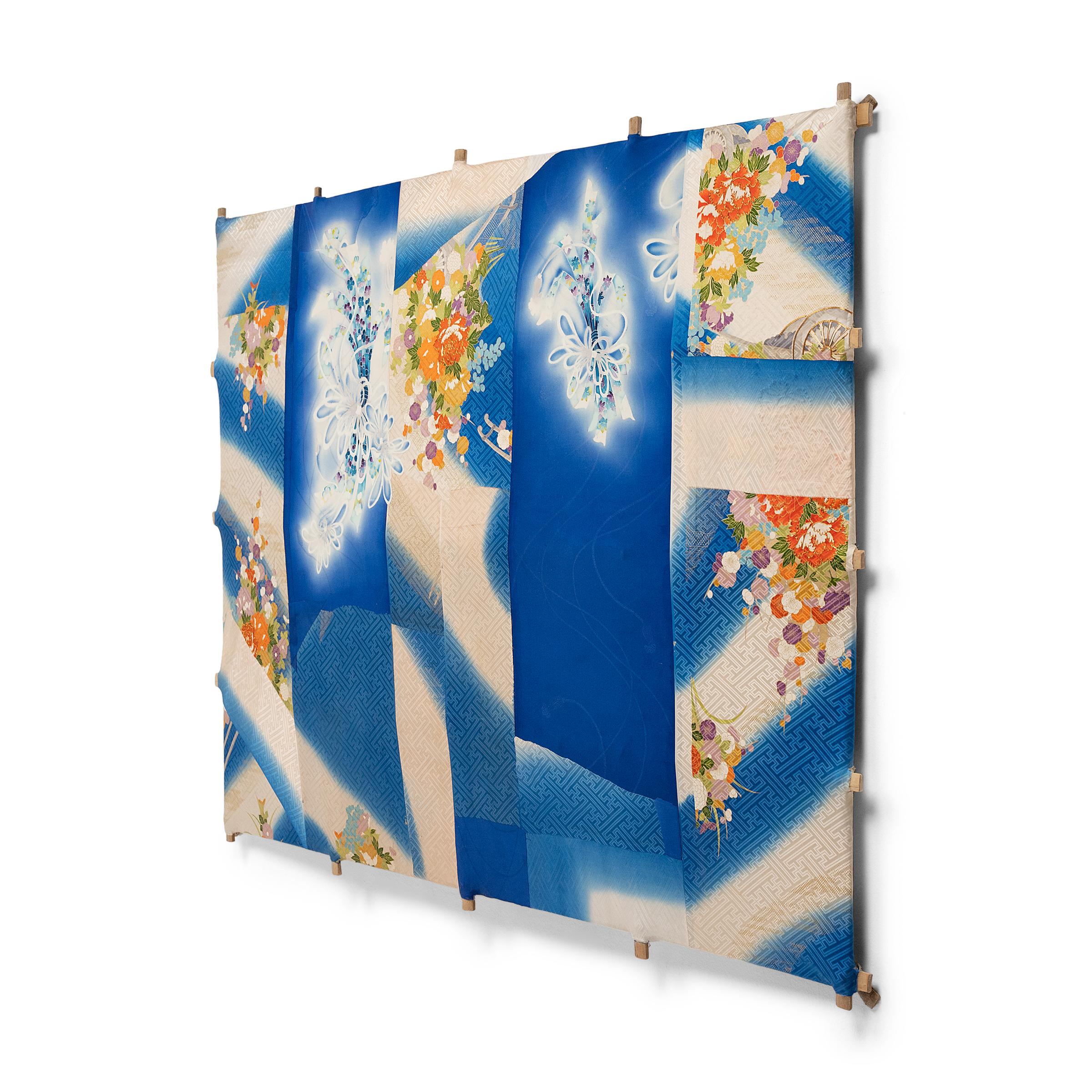 In this kite entitled “Ebb Tide," Thompson aligns fine kimono silks to create a swirling collage of blue and white color, suggesting the gentle movements of a calm body of water. Panels of beautifully patterned silk enliven the surface with a soft gradient of deep blue to warm crème, textured with a diamond weave and further decorated with subtle metallic details and flower carts laden with blossoms. Vertical panels of dark blue silk interrupt the swirling current, illuminated by bundles of ribbon tied with cord tassels, each aglow with an ethereal halo of white light.