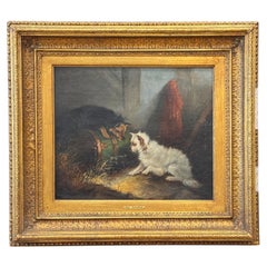 Peinture à l'huile ancienne sur toile représentant un chien bull français et un chien terrier. La peinture est vraiment frappante et raffinée. Signé à droite en dessous par l'artiste...