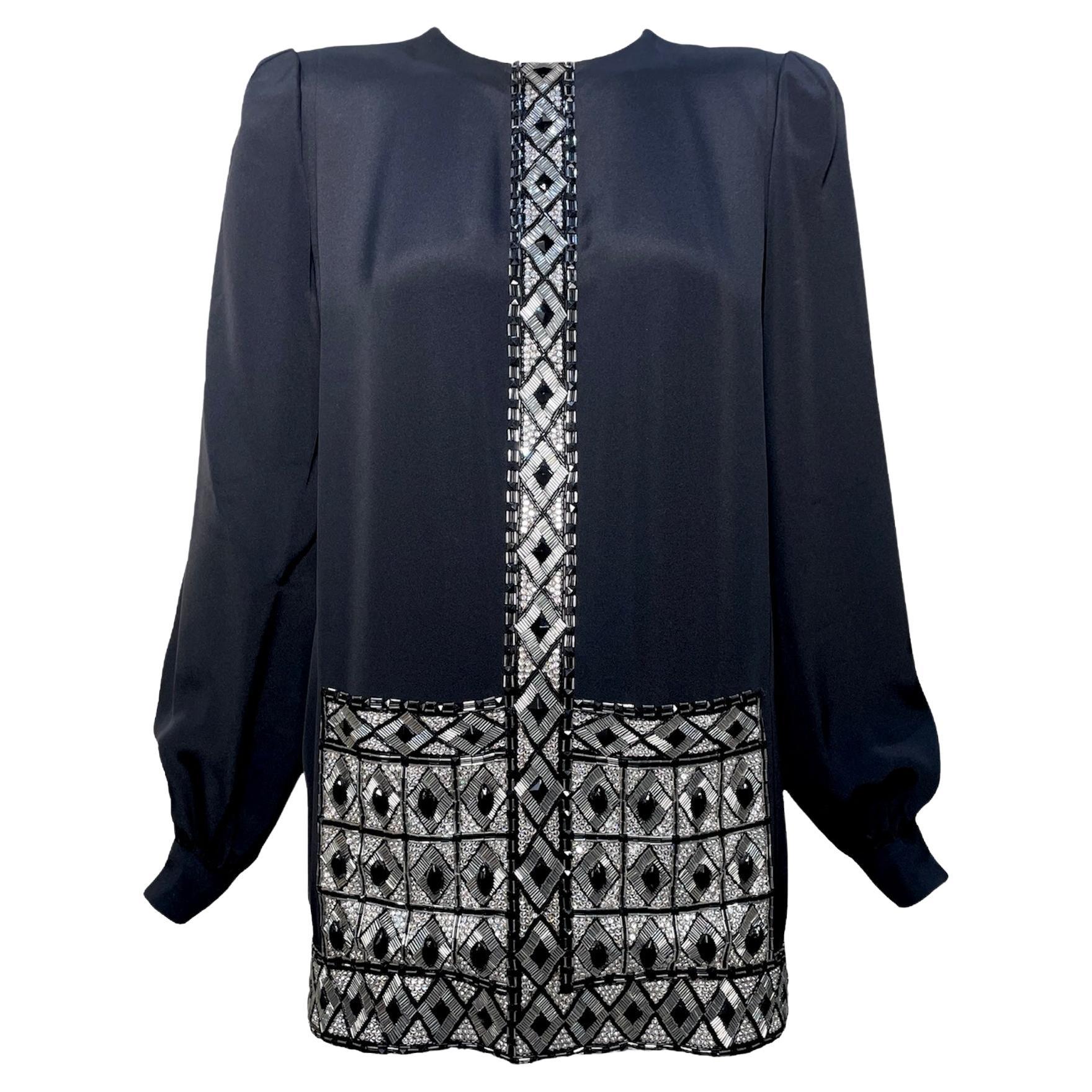 Mini robe tunique en soie géométrique embellie, noir, André Laug, années 1980