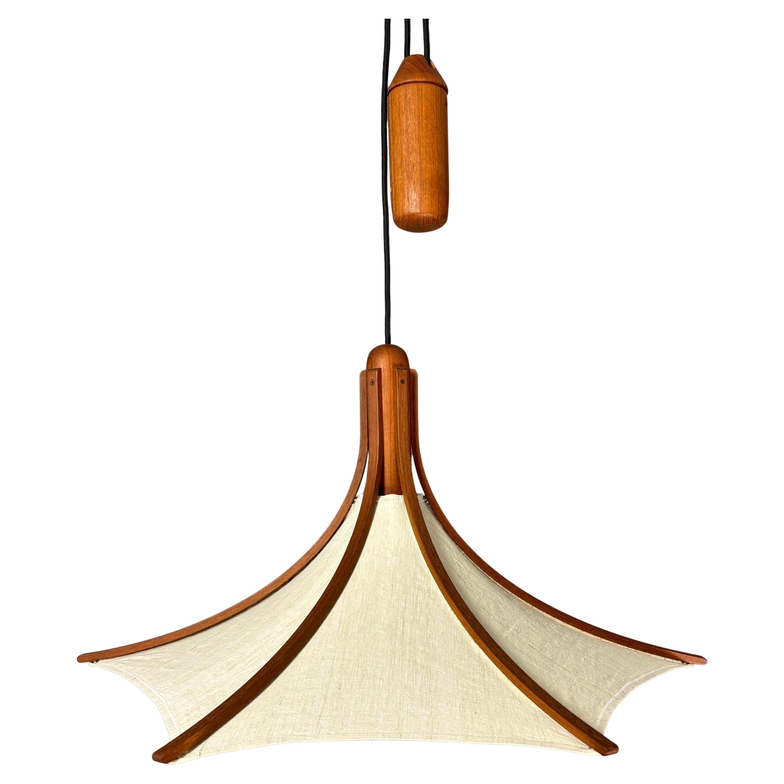 Teak and linen umbrella pendant by Domus, 1970s. This lamp is in great condition considering its age. The linen shade is removable if needed to be washed. This is the largest version...