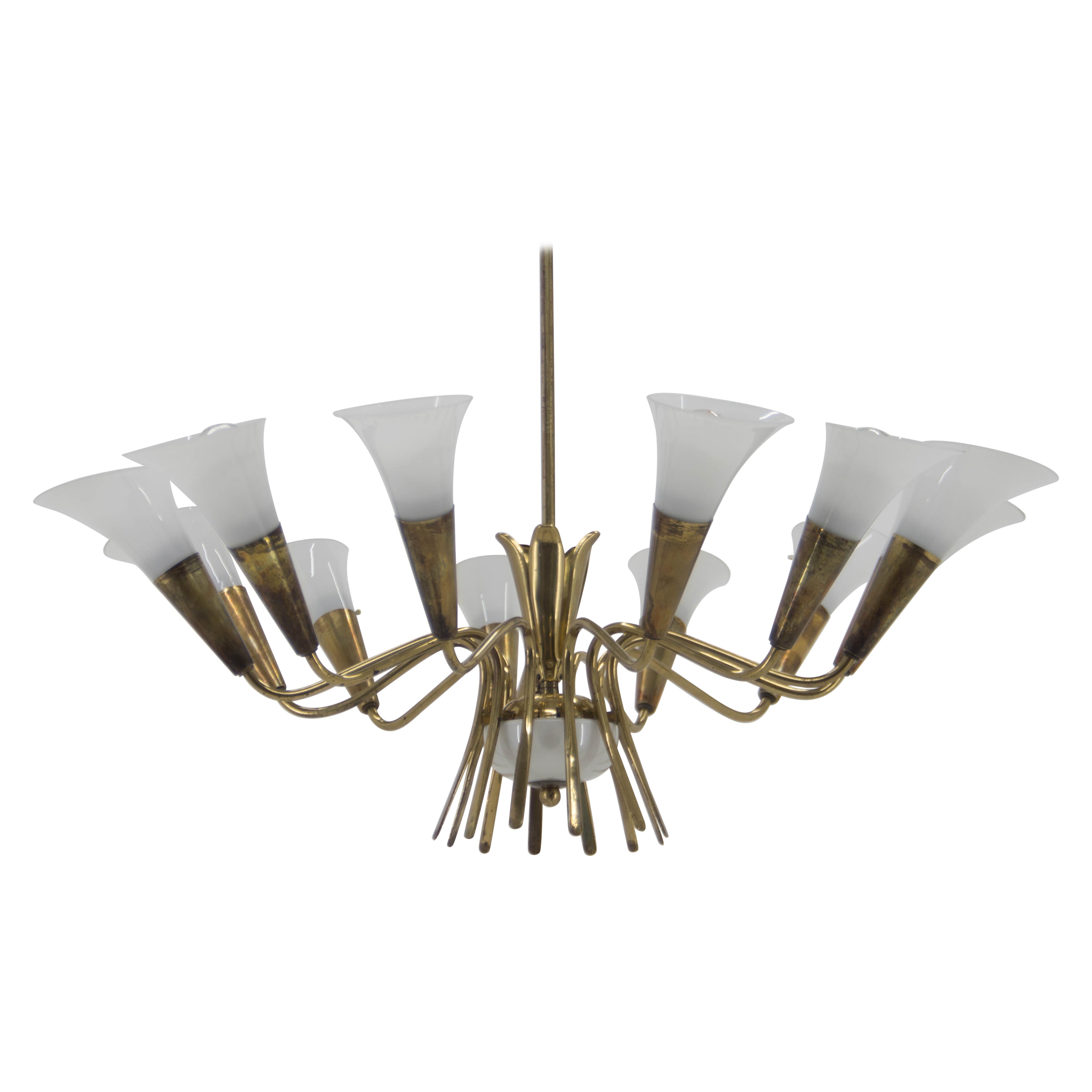 Fabriqué en Tchécoslovaquie Fabriqué en verre de lait, laiton 5x40W, douille E27 ou E26 Avec patine d'ancienneté Re-polissage Entièrement fonctionnel État original.