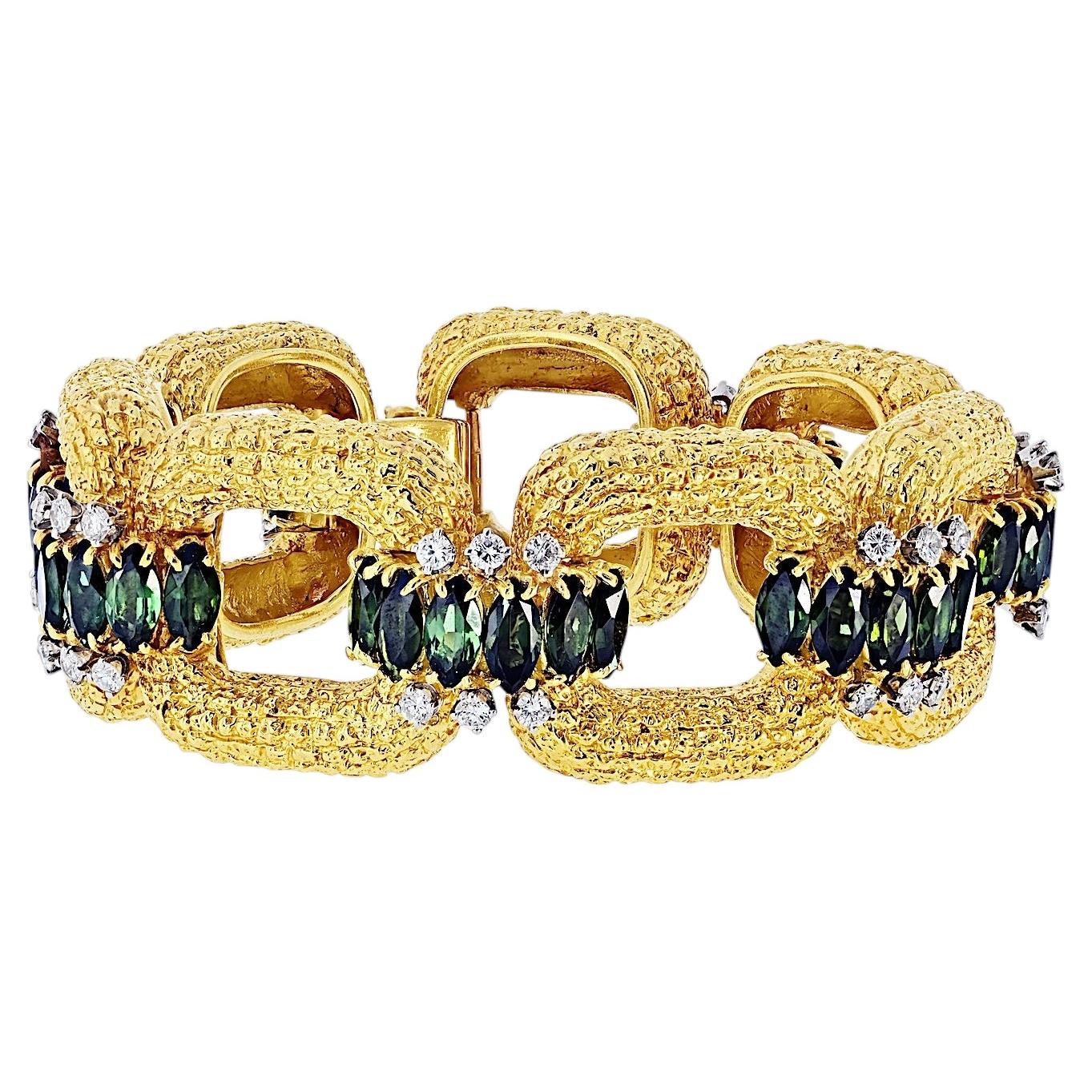 Bracelet à maillons La Triomphe en or jaune 18 carats, datant des années 1970, conçu avec une structure aérienne à maillons ouverts, sertie de tourmalines vertes taillées en marquise...