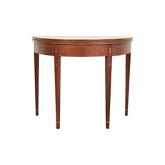 Table console en acajou de style Régence anglaise de Mersman, vers les années 1960. Le plateau Demilune est surmonté d'un tiroir en frise avec incrustation de rayures, flanqué d'un ...