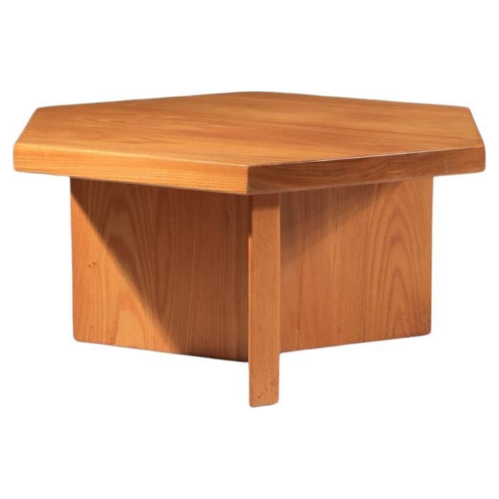 Table basse hexagonale française des années 60, éditée par Maison Regain. Base tripode et plateau hexagonal épais entièrement en orme massif. Design/One élégant. Vintage By, avec des...