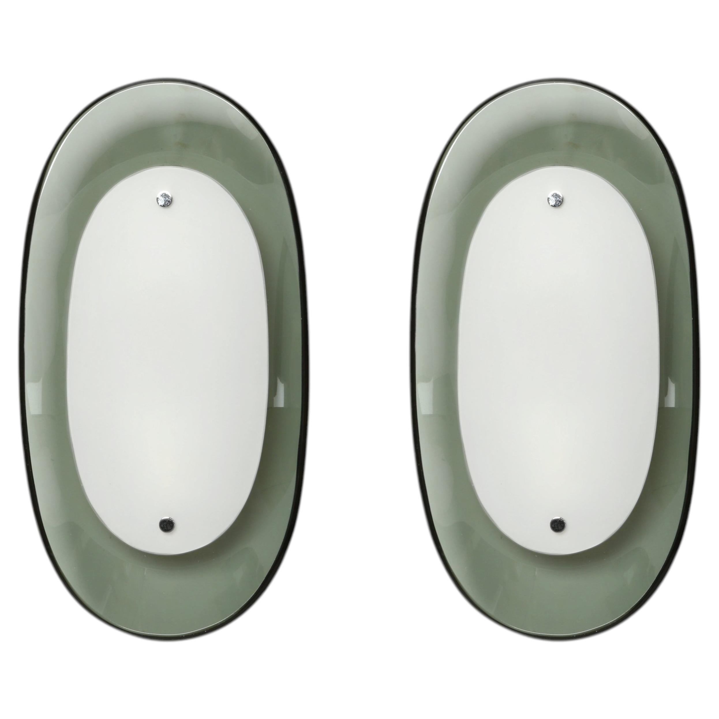 Paire d'appliques murales françaises et italiennes en verre de Murano biseauté soufflé à la main, conçues par Max Ingrand et produites par FontanaArte, en bon état. Les appliques légèrement fumées sont découpées selon un motif ondulé qui donne un effet lumineux étonnant, soutenu par une base rectangulaire en laiton poli. Chaque applique contient une douille à deux lumières. Les fils ont été changés. Usure conforme à l'âge et à l'utilisation. Circa 1940 - 1950, Milan, Italie.