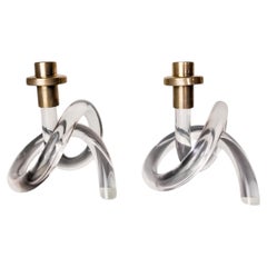 Paire de bougeoirs post-modernes conçus par Elaine Bscheider pour Dorothy Thorpe Inc, États-Unis, années 1970. Corps en forme de prézel en méthacrylate/acrylique transparent avec des...