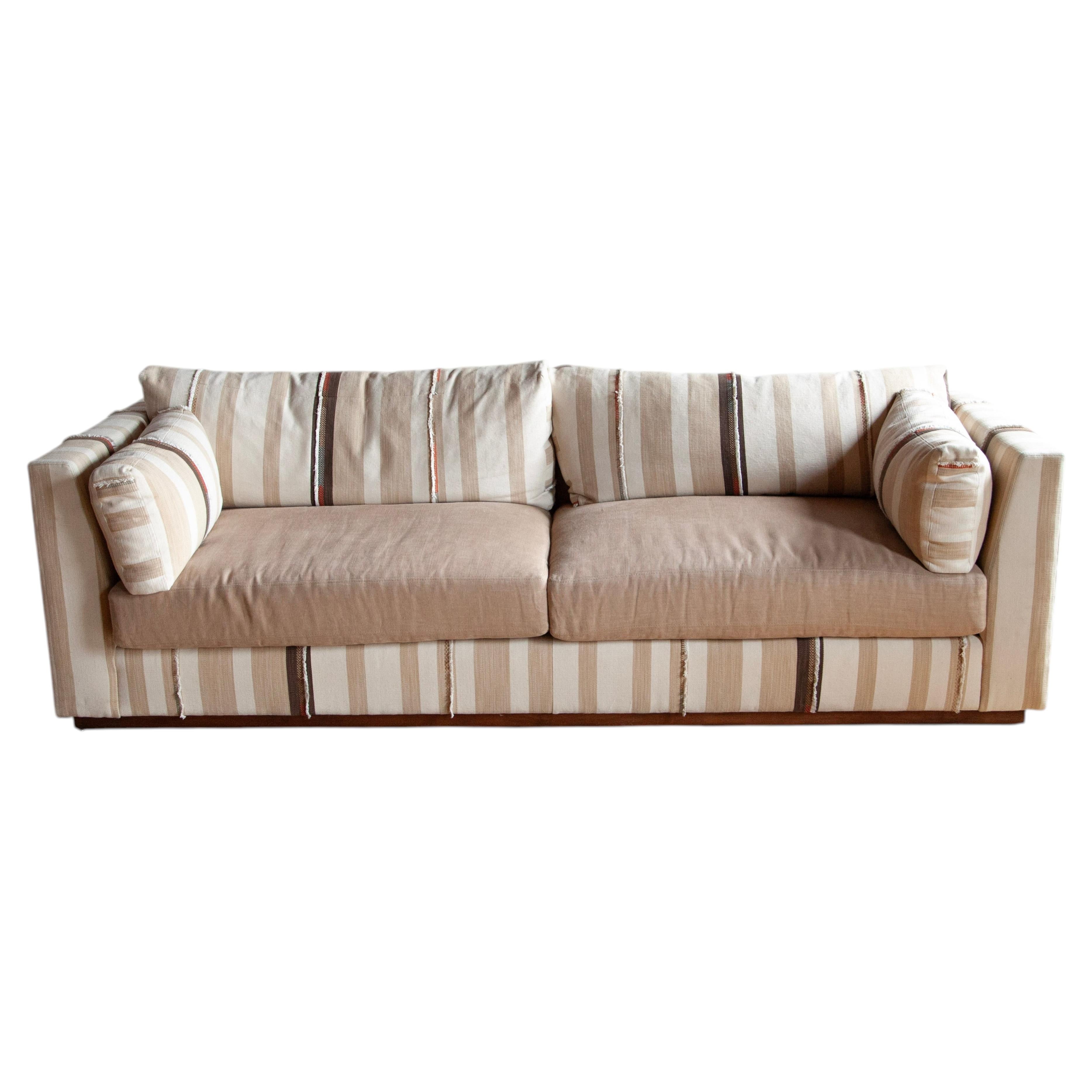 Une belle chaise d'écrivain Ralph Lauren Home et un ottoman d'écrivain surdimensionné et touffeté assorti, finis dans le tissu à rayures en lin Amelot de Ralph Lauren. Le tissu itali...