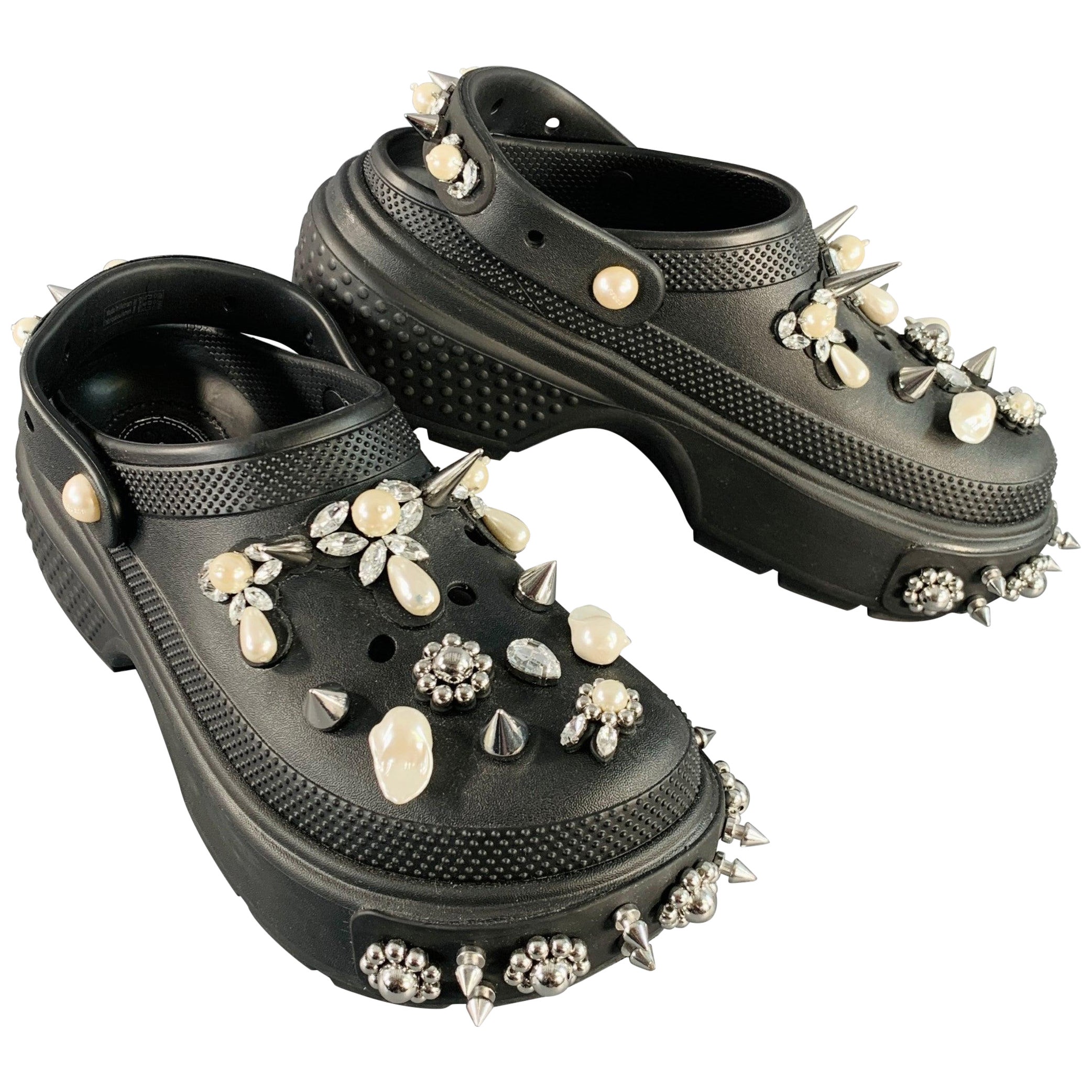 Sabots SIMONE ROCHA x CROCS "Stomp" en caoutchouc noir avec un superbe design clouté en métal argenté avec de fausses perles et des détails en cristal, une semelle épaisse et une fer...