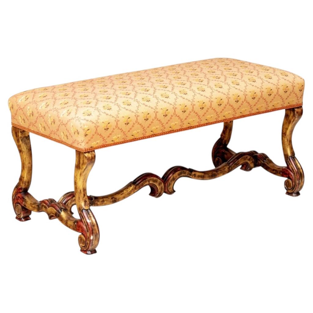 Le banc présente une base en noyer très ornée, sculptée à la main, avec des motifs de volutes spectaculaires et des pieds en cabriole. Ce modèle spécifique est souvent appelé banc Vo...