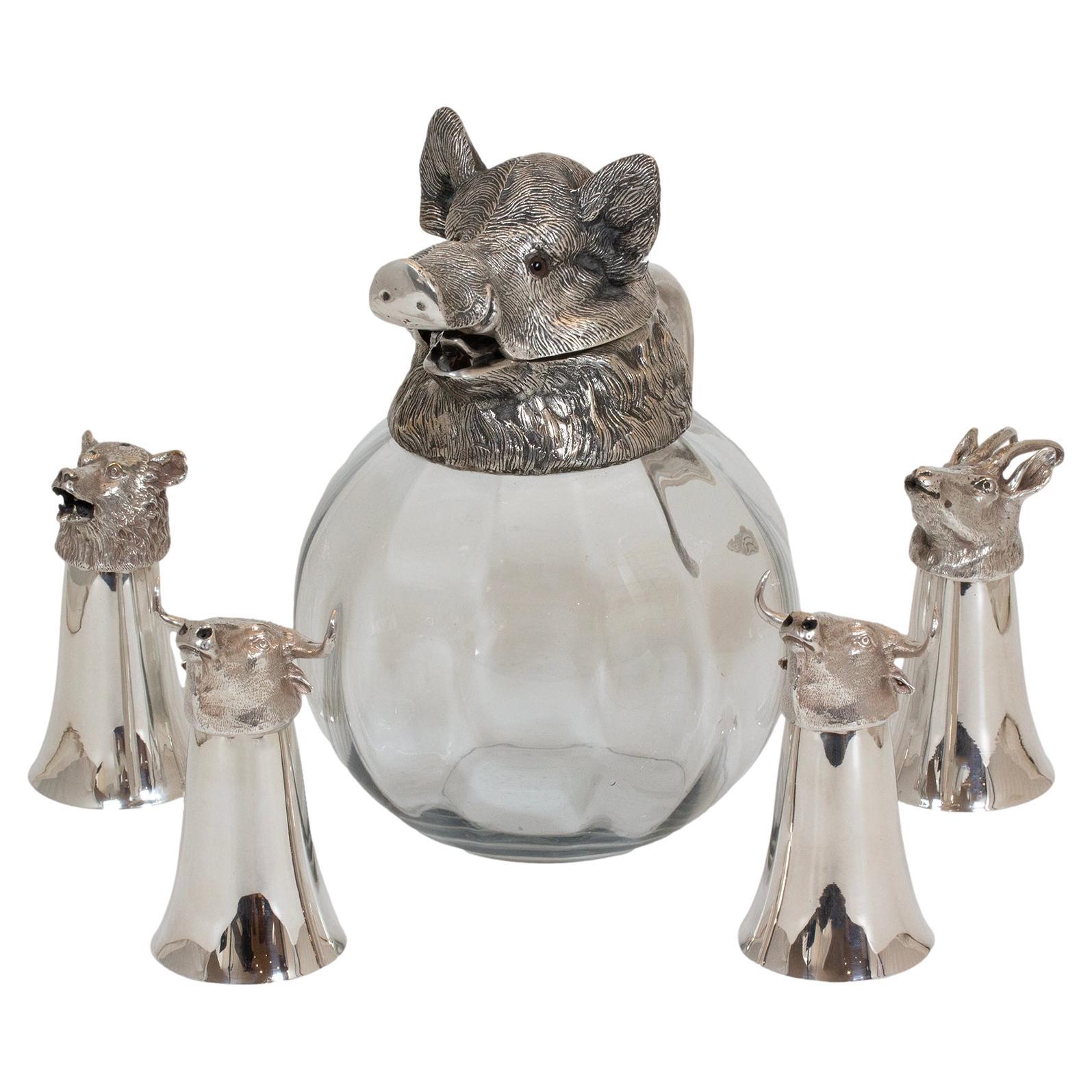 Magnifique et rare service à boissons complet du milieu du siècle sur le thème du sanglier, comprenant une carafe à tête de sanglier, six gobelets à étrier assortis et un plateau ass...