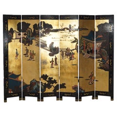 Paravent chinois vintage à huit panneaux en bois et laque. Cet écran représente la vie quotidienne d'un côté et un paysage avec des oiseaux et de la faune de l'autre.