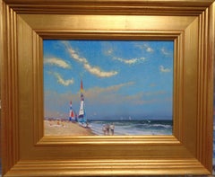 Beach Day III est une petite peinture à l'huile sur toile de l'artiste contemporain primé Micha...