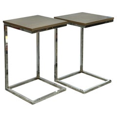 Magnifiques tables d'appoint C.I.C. chromées et en bois. Il y a une paire de tables d'appoint A.I.C. chromées avec des plateaux en bois. Ils mesurent 26" de haut, 16" de large et 16...