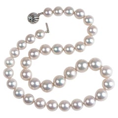 Cet exquis collier de perles de culture des mers du Sud se compose de 37 perles blanches et argentées graduées mesurant environ 10 à 14 mm, qui présentent un éclat naturel et lustré....