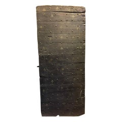 Porte d'entrée rustique ancienne, un battant cloué avec des clous disposés en X, complète avec les fers d'origine. Ouverture à droite, donc peut-être une porte de prison ou d'entrepô...