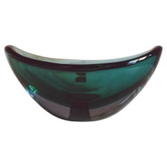 Il s'agit d'un cendrier en verre jaune Bulé avec des décorations à l'intérieur. La couleur se situe entre le transparent et le jaune-vert. Le vert est très épais. Il s'agit d'un exem...