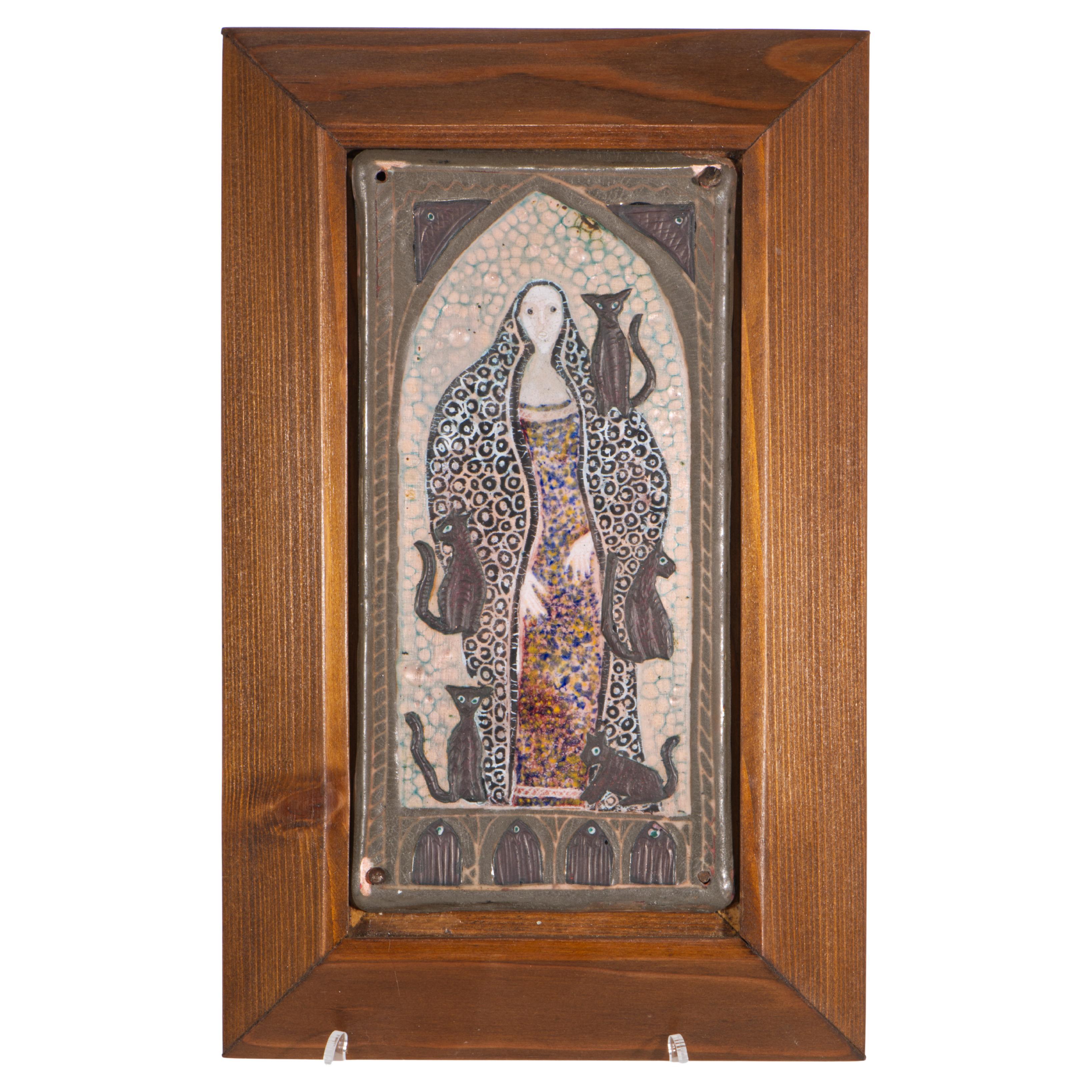La plaque originale d'art naïf hongrois représente une jeune fille ou une jeune femme accompagnée de cinq chats. La jeune fille se tient dans l'embrasure d'une porte cintrée, elle po...