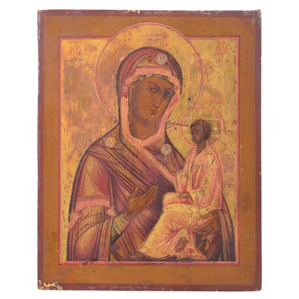Icône russe (ou peut-être icône de Notre-Dame de Kazan/Mère de Dieu de Kazan) à la détrempe (et peut-être à la feuille d'or) sur panneau de bois représentant la Madone (Mère Marie) e...