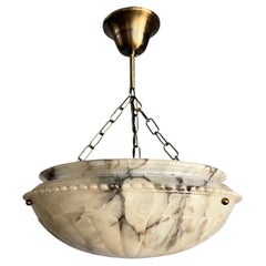 Grand albâtre blanc aux veines sombres prononcées, suspendu à une structure raffinée en laiton avec trois points lumineux internes. Cette suspension Art déco allemande, datant des a...