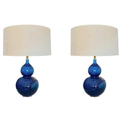 Paire de lampes de bureau chinoises anciennes en porcelaine famille rose et bronze doré bleu vert
