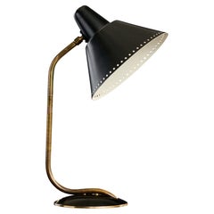 Lampe à poser modèle 5066 conçue par Paavo Tynell et fabriquée par Taito/One en Finlande dans les années 1950. La lampe est dotée d'un pied rond en laiton, d'une jambe en bois dur et...