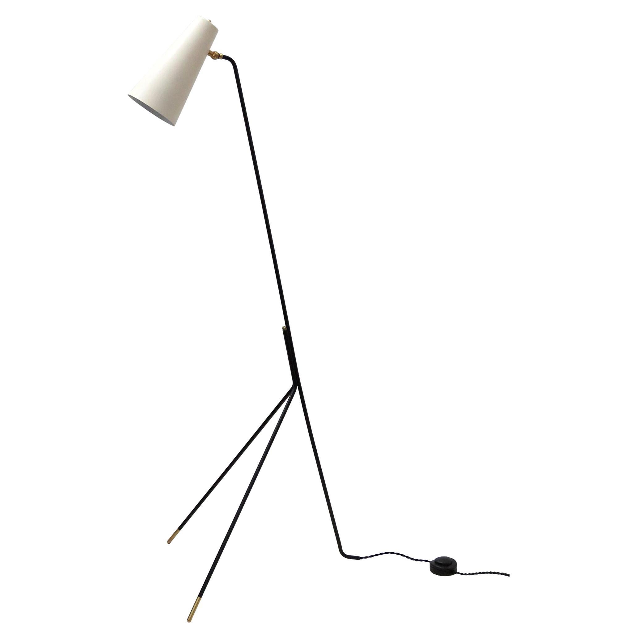 Merveilleux lampadaire tripode minimaliste de Gallery L7, fabriqué et fini à la main à Los Angeles, structure enduite de poudre noire avec accents en laiton et grand abat-jour coniqu...