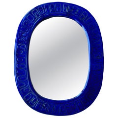 Miroir mural en verre de couleur bleue produit par Pukebergs Glasbruk, Suède, vers les années 1960. Zones désargentées ; usure due à l'âge et à l'utilisation. Dimensions globales (...