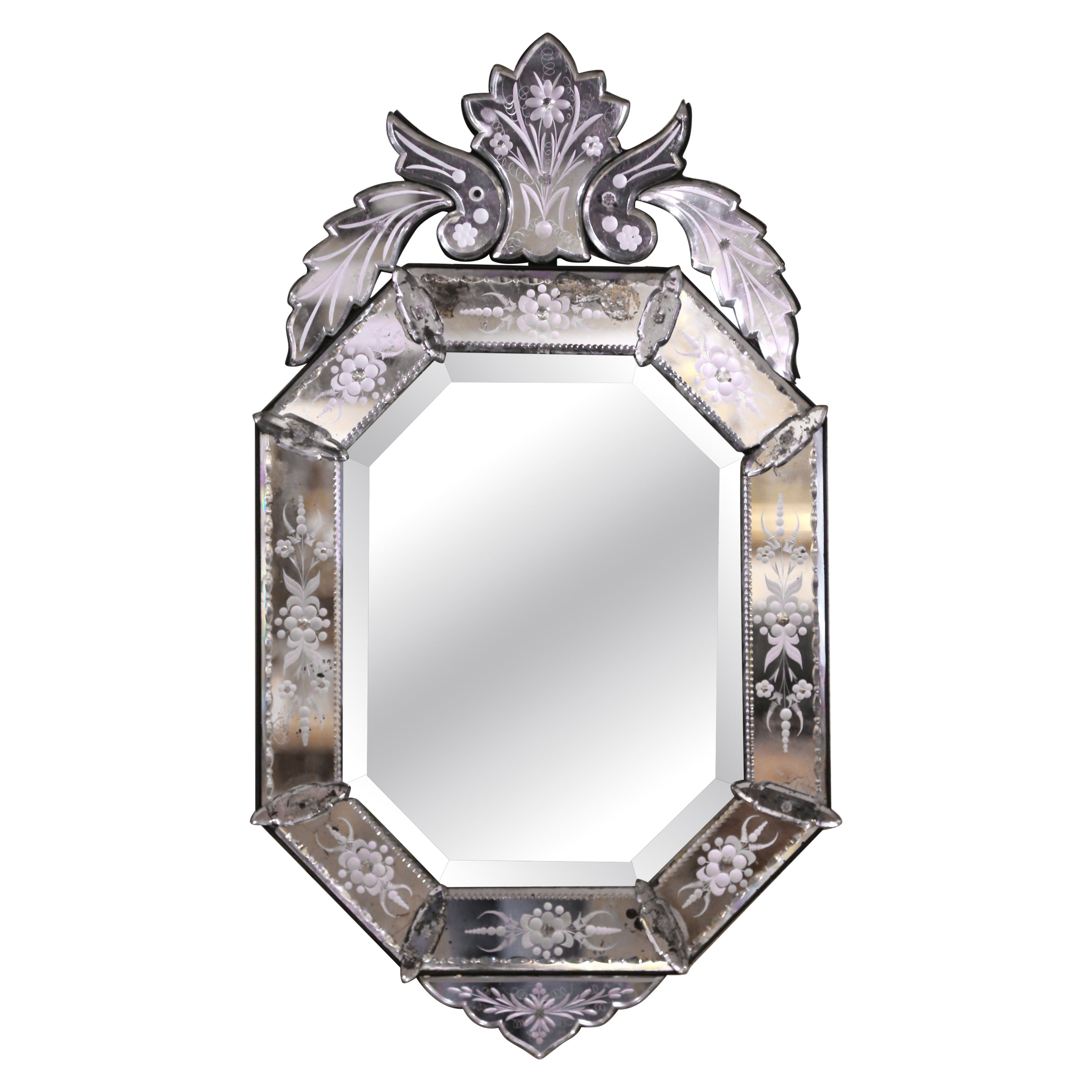 Un élégant miroir en verre de Murano, fabriqué à la main à Venise, en Italie, datant des années 1960 ou avant. Ce miroir au décor complexe et au bord incurvé est richement orné de mo...
