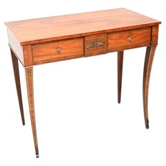 L'écritoire à charnière présente une surface d'écriture en cuir vert et doré qui renferme un intérieur en noyer satiné avec deux petits tiroirs.