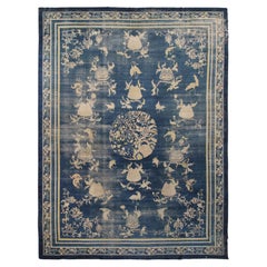 Ce superbe tapis antique de Pékin est un chef-d'œuvre de l'art textile chinois. Il présente un vibrant motif de "Cent oiseaux" sur un fond indigo profond. Noué à la main avec de la l...