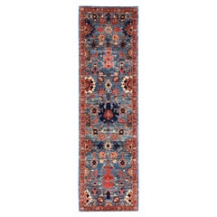 Tapis de course antique Heriz du début du 20e siècle avec un médaillon géométrique multiple dans un motif rouge et bleu et une bordure. Ce tapis mesure 2'10" x 13'10".