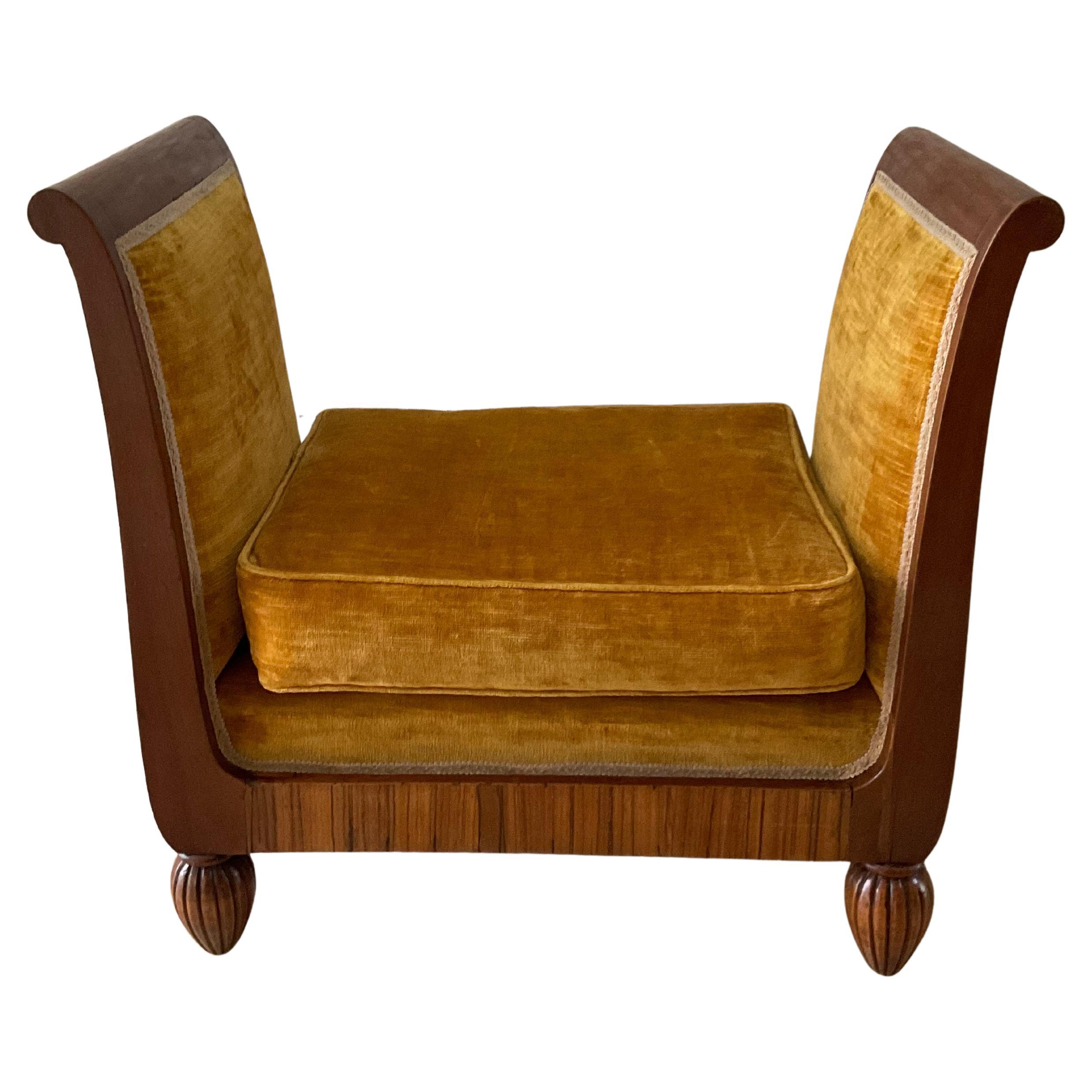 Banquette d'angle de salle d'exposition personnalisée avec placage en bois de zèbre et tissu Cassaro d'Italie. Également disponible C.O.M. Chaque banc mesure 28" de profondeur, 56...