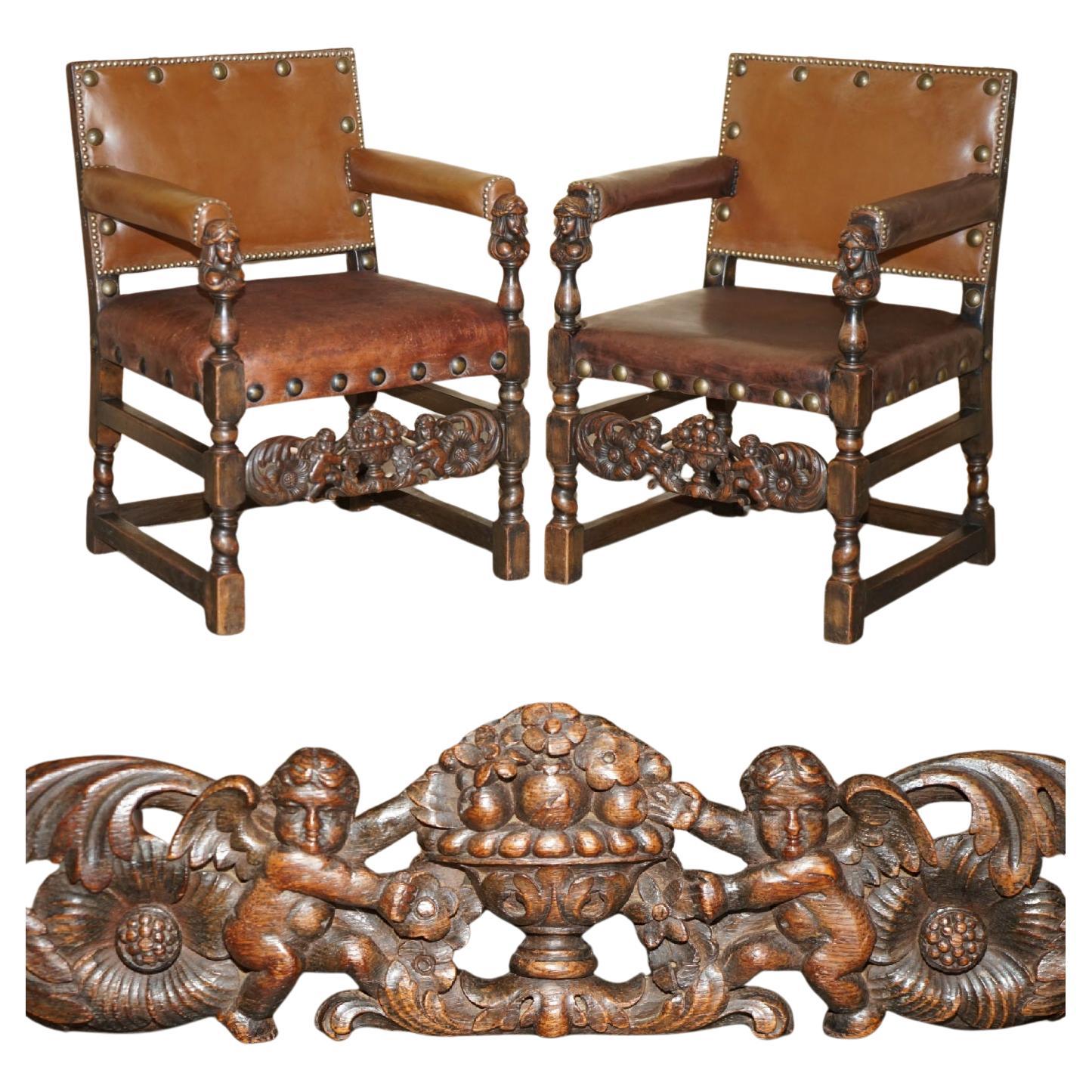 Fauteuil baroque anglais en chêne et cuir toilé avec pieds torsadés en orge