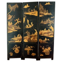 Vintage peint à la main, style Chinoiserie, paravent à 3 panneaux